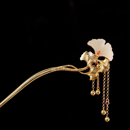 纯银鎏金三生有杏民族国风设计s925银步摇饰品女和田玉银杏叶发簪