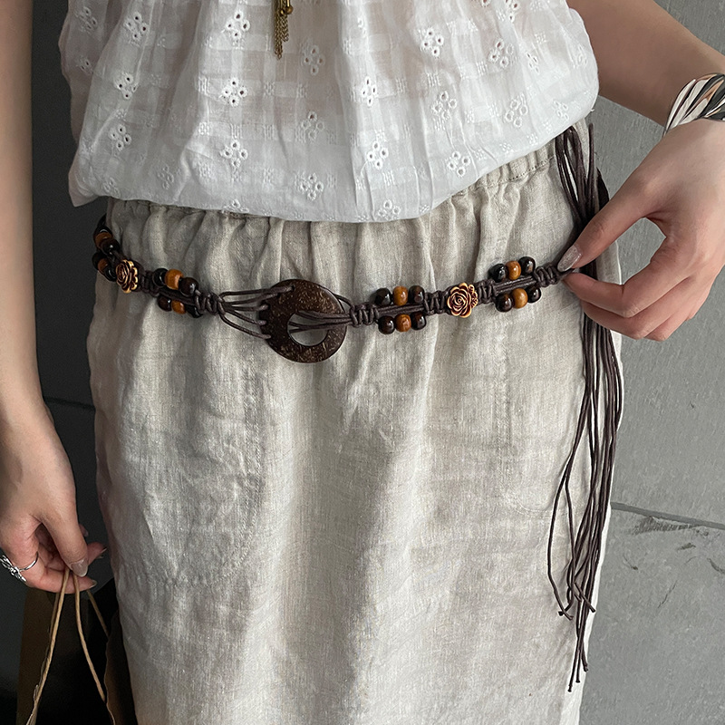 波西米亚小众编织花朵腰绳女复古椰壳设计感串珠配裙子配饰腰带潮