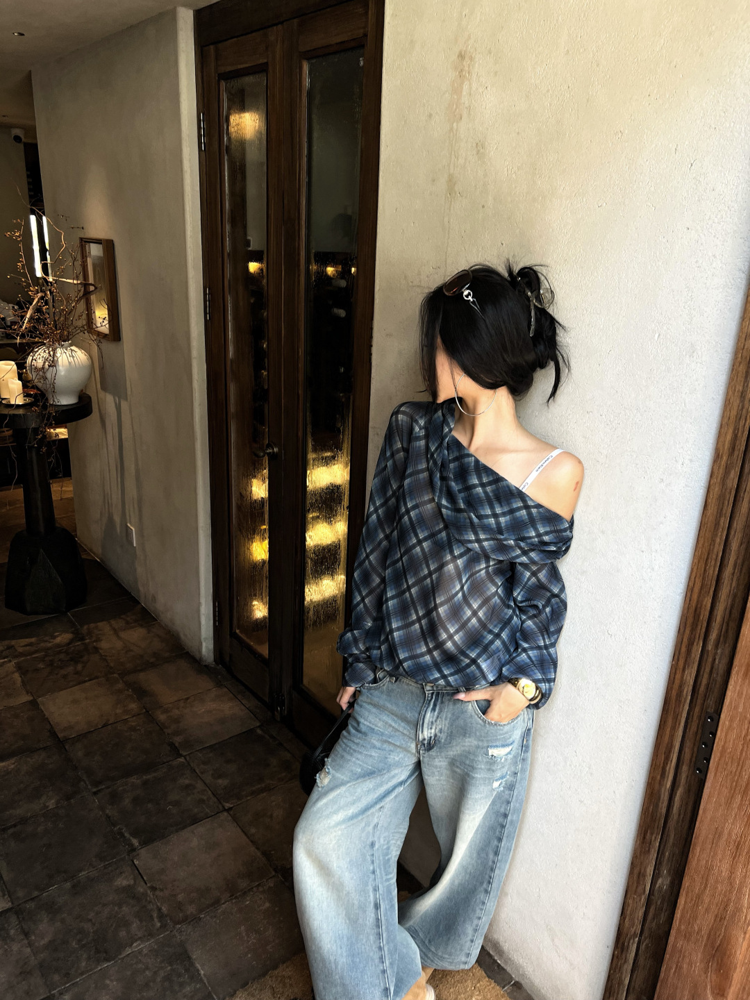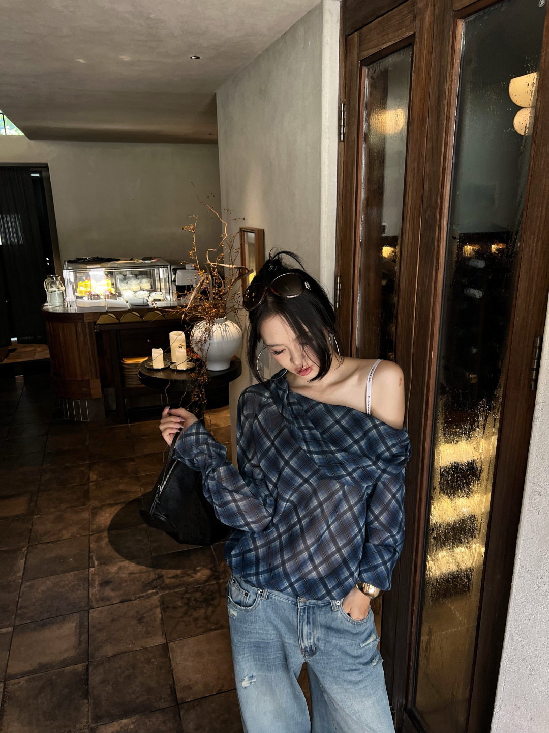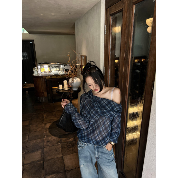 复古格子斜肩长袖T恤女秋季微透显瘦露肩上衣