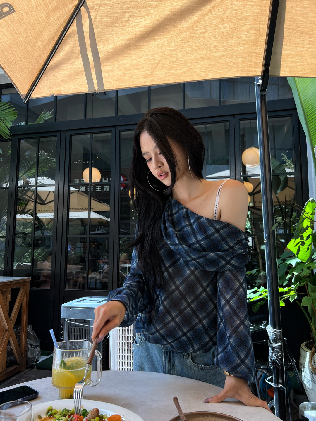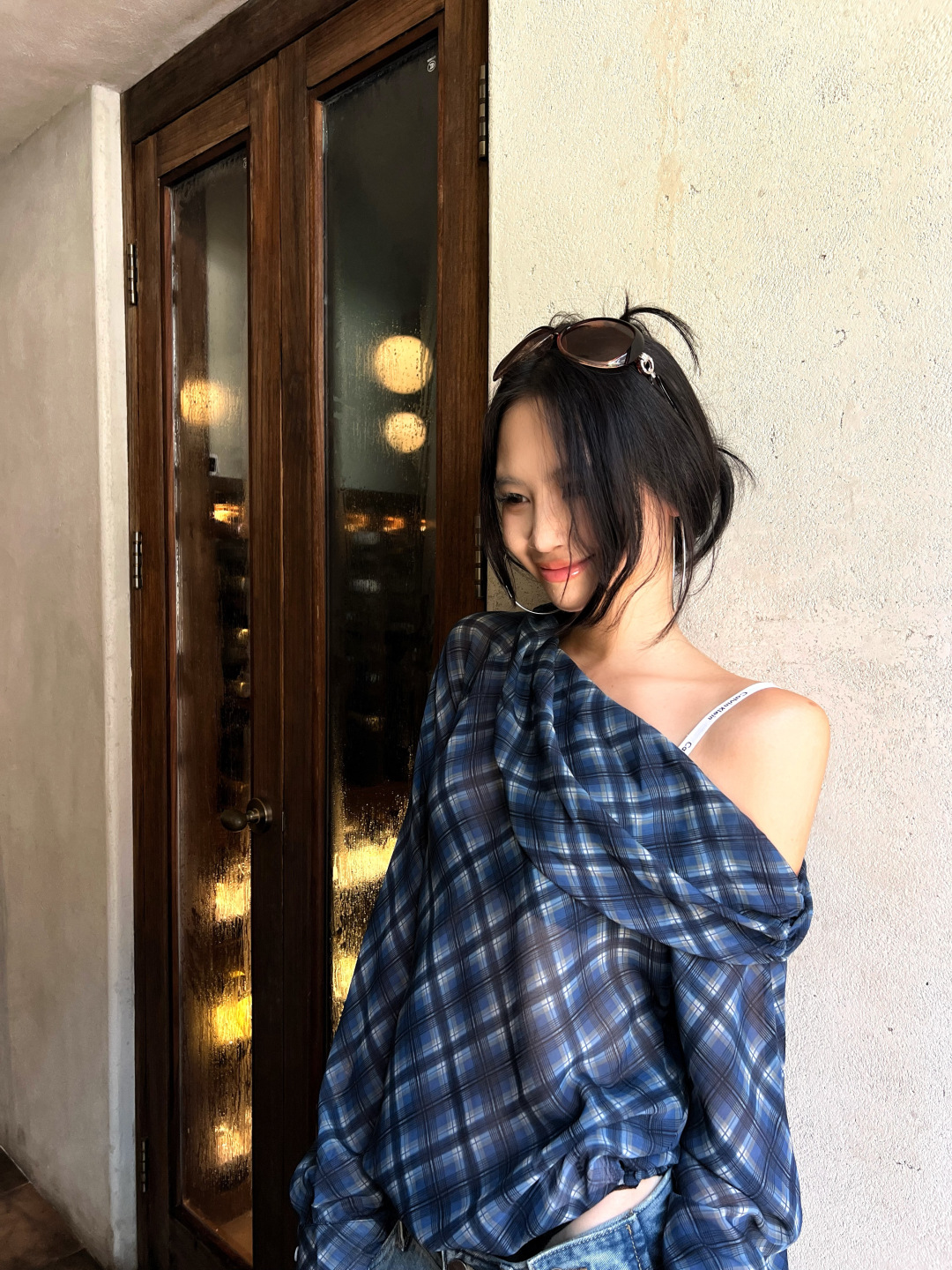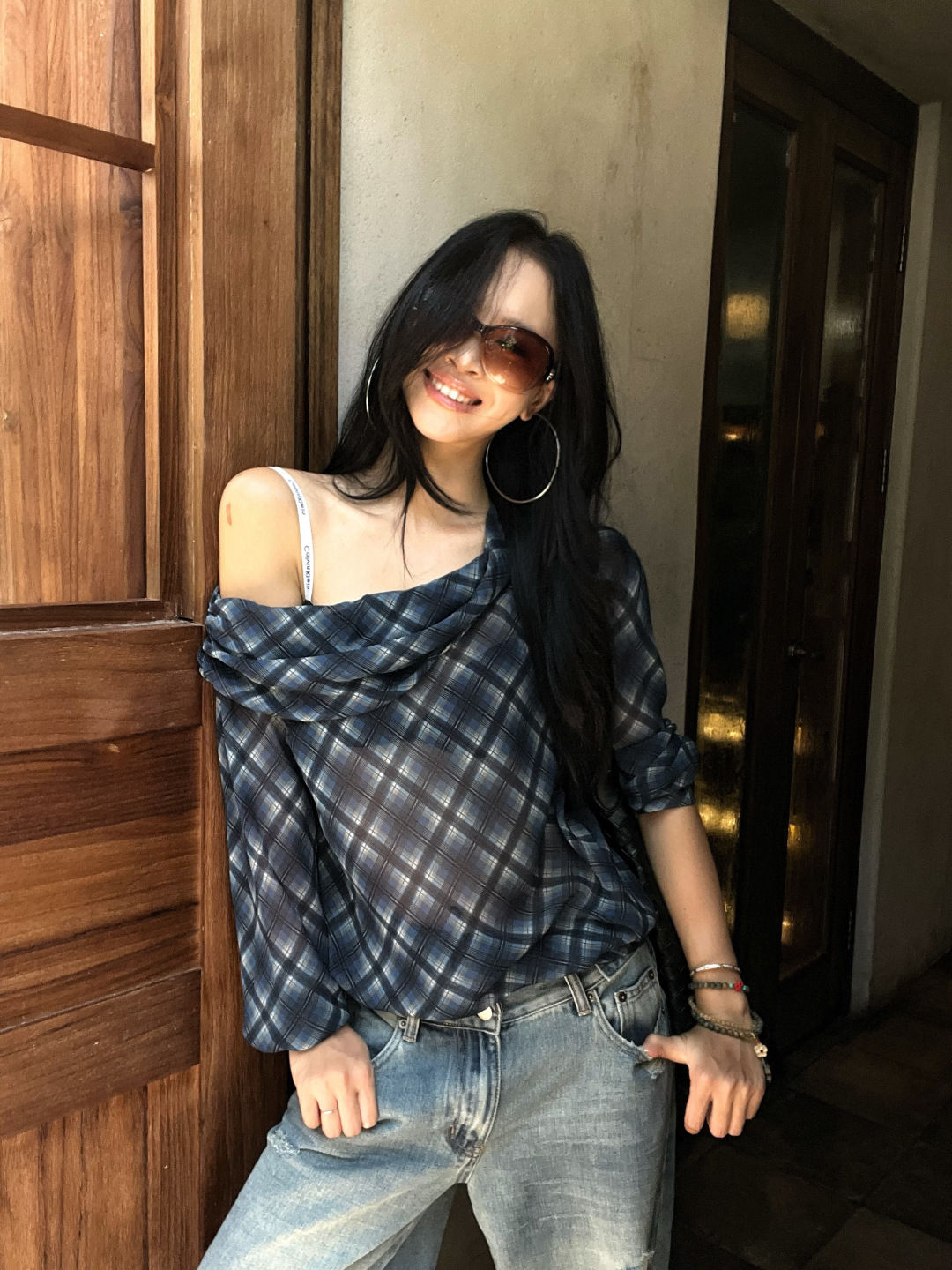 复古格子斜肩长袖T恤女秋季微透显瘦露肩上衣