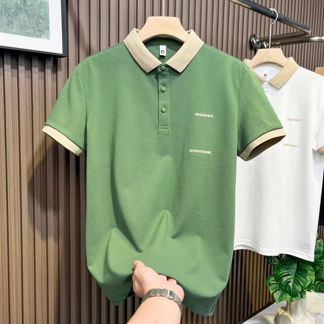 新款夏季薄翻领T恤男士短袖休闲上衣拼接撞色POLO衫白色黑色