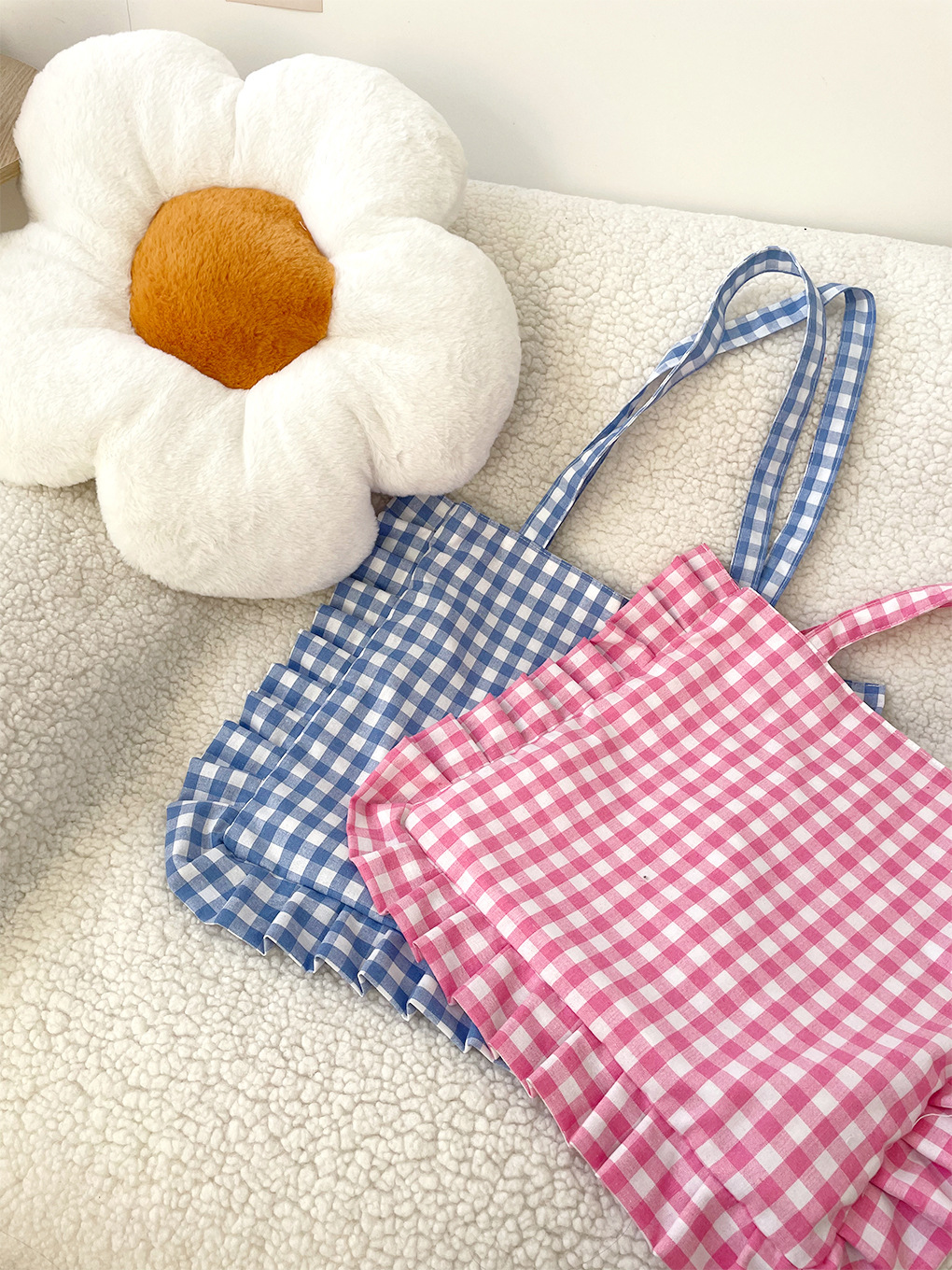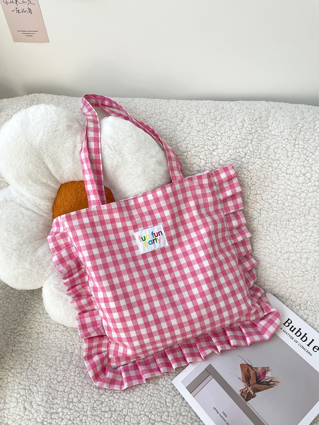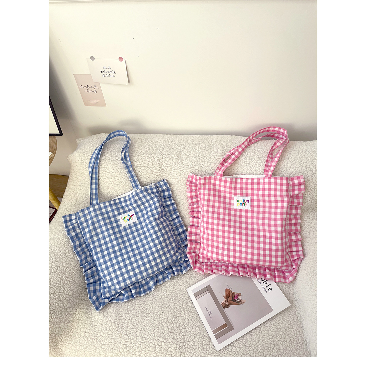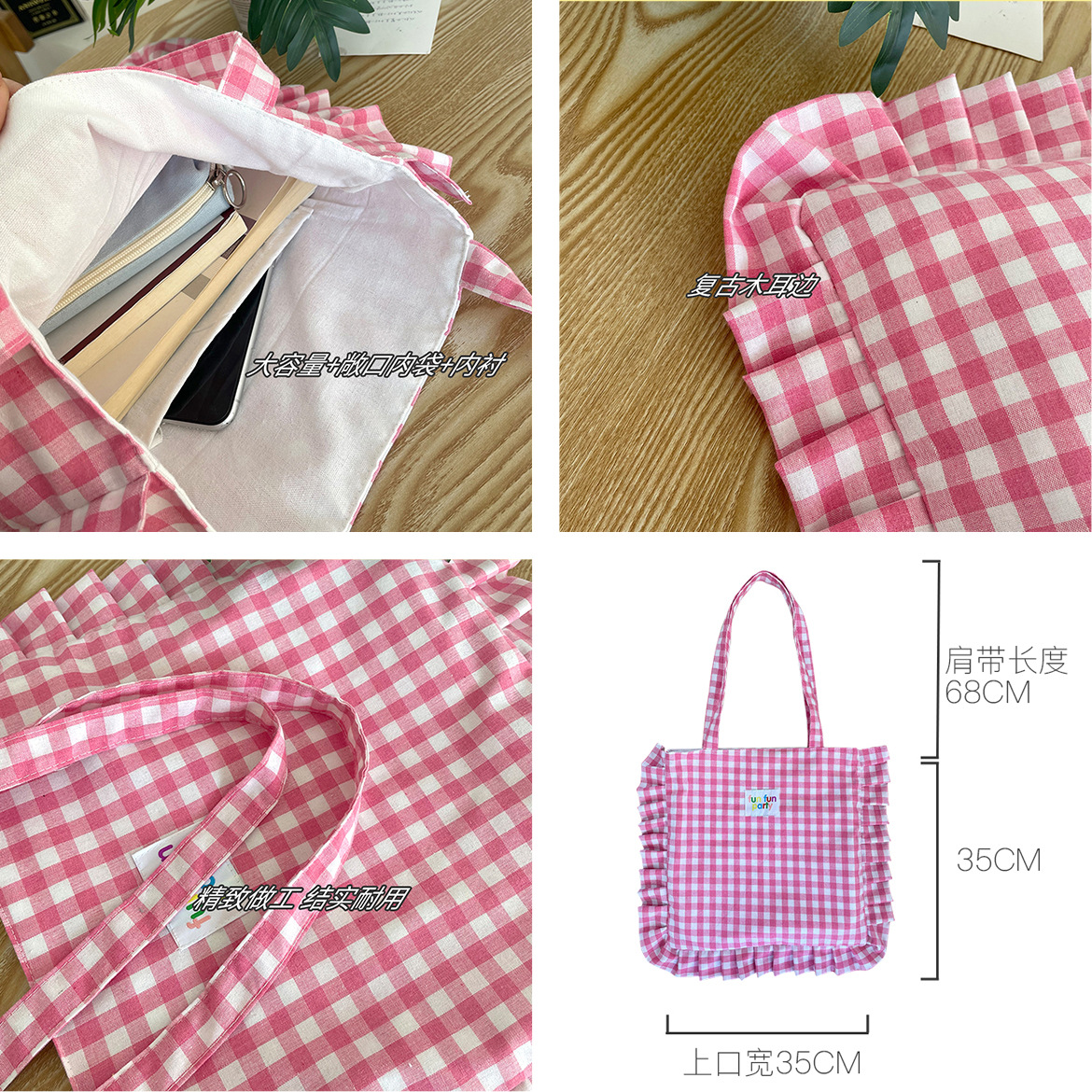 清新格子荷叶边单肩包可爱花边枕头包日常通勤托特ins韩风学生包