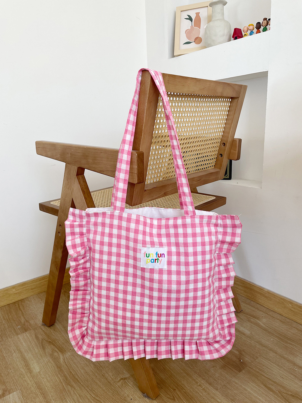 荷叶边格子单肩包-浅粉