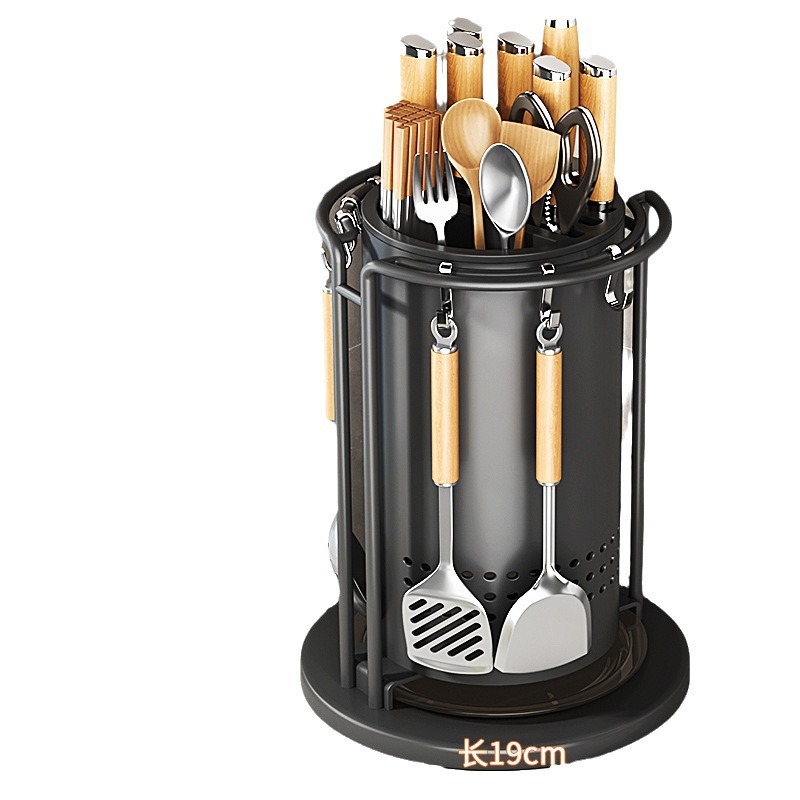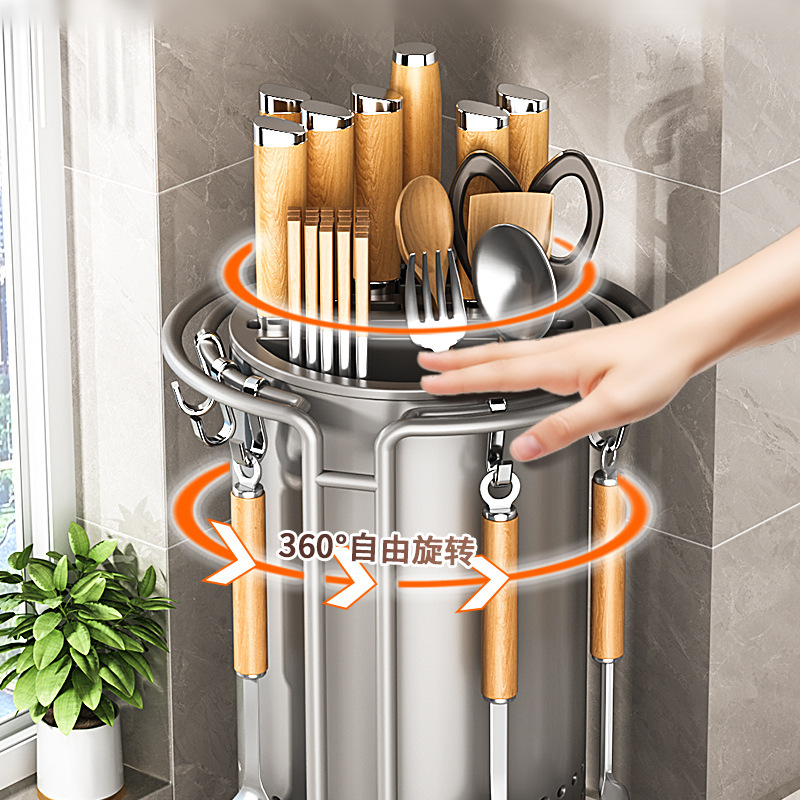不锈钢厨房旋转刀架台面置物架多功能刀具锅铲筷子筒一体收纳盒子