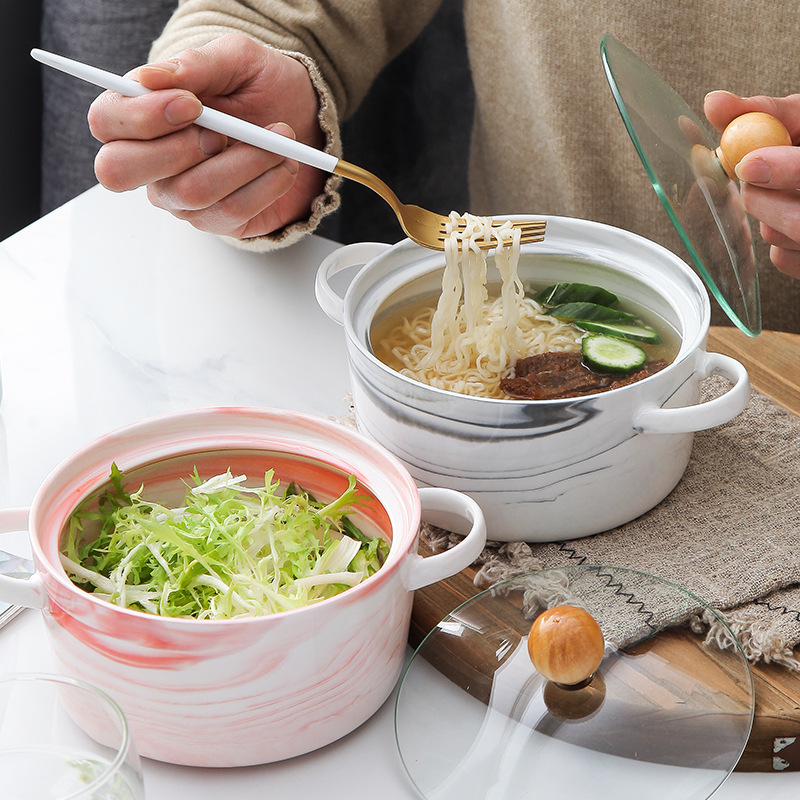 家用陶瓷泡面碗带盖汤锅马卡龙釉下彩高颜值双耳汤碗