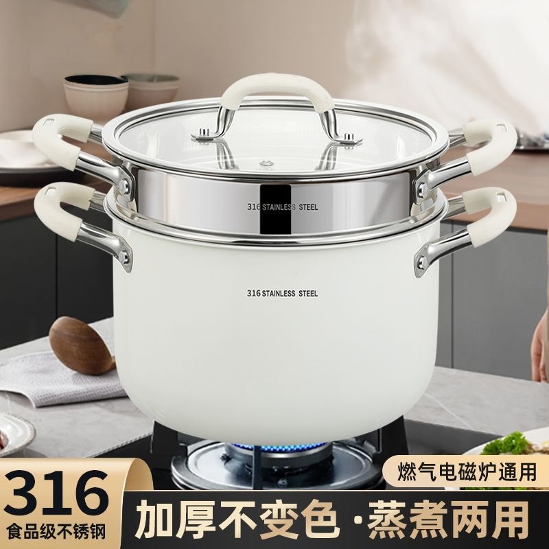 316L不锈钢汤锅家用加厚无涂层煮粥锅蒸煮一体陶瓷锅电磁炉高汤锅