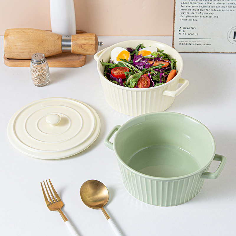奶油风陶瓷双耳汤碗大号带盖猪油罐家用