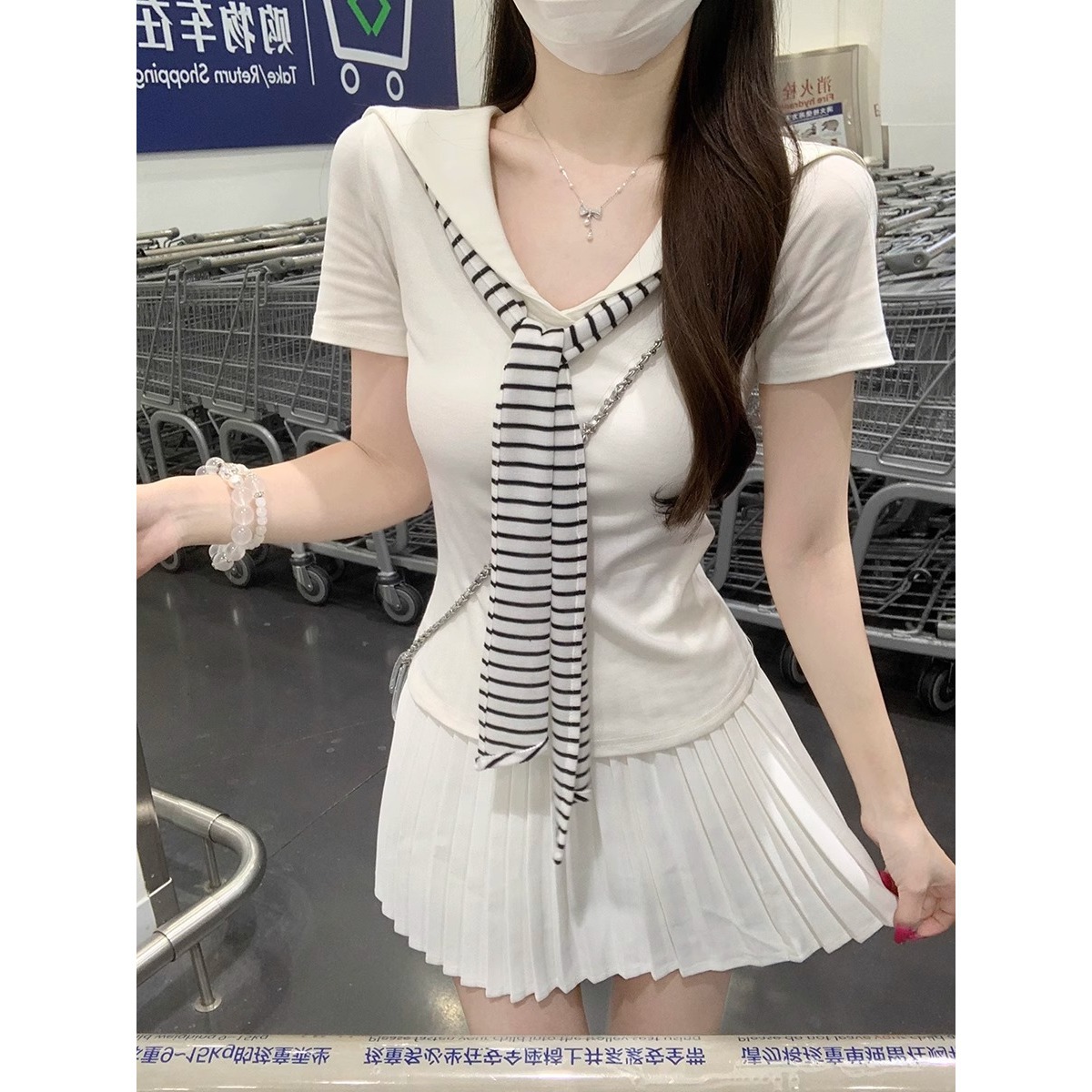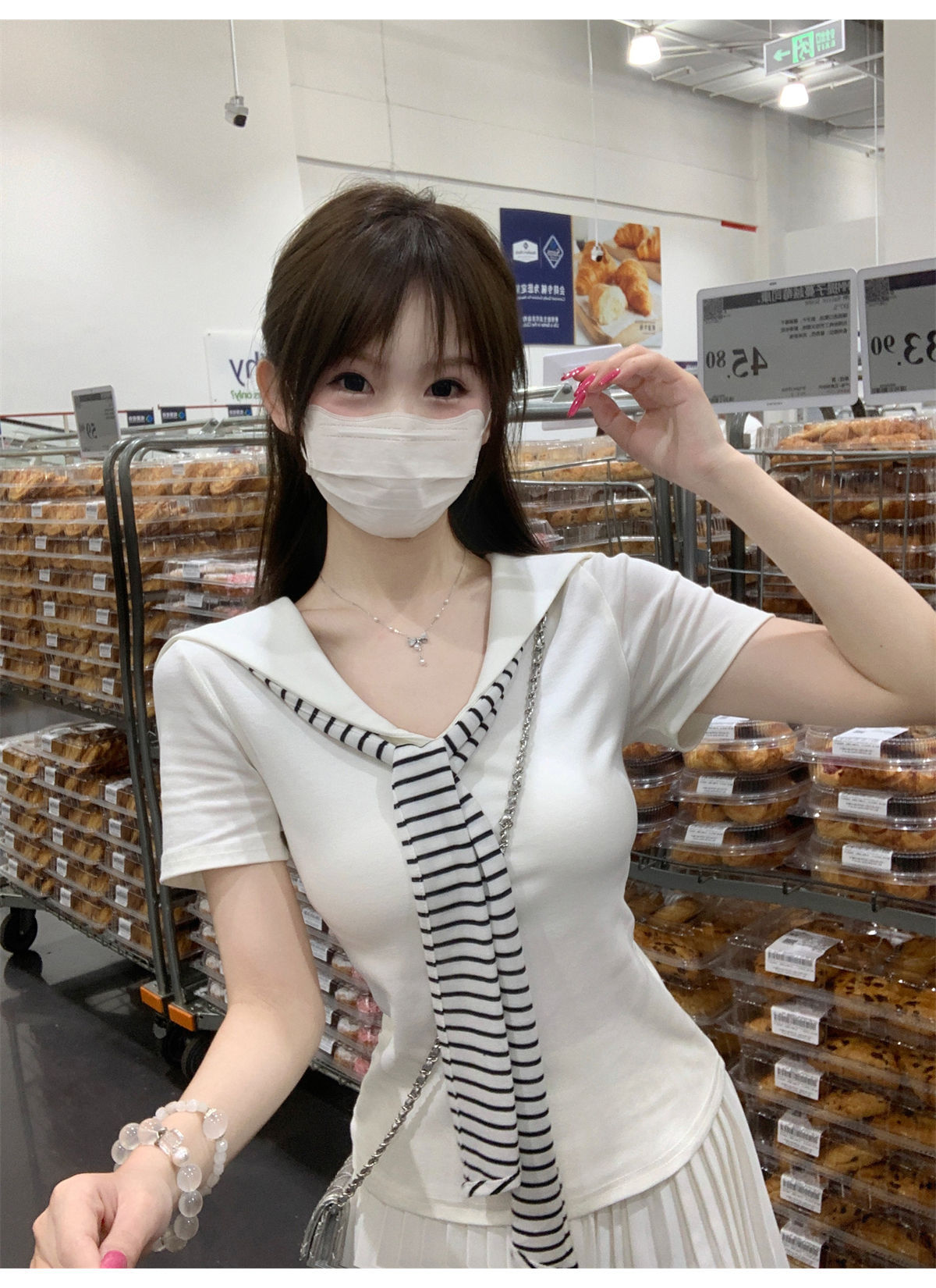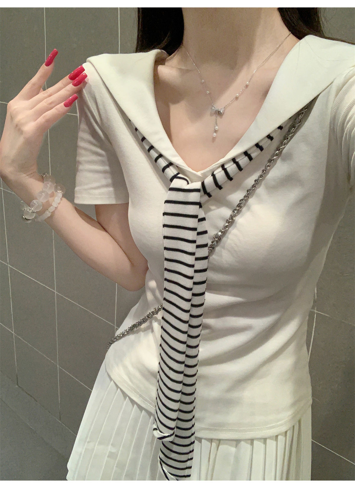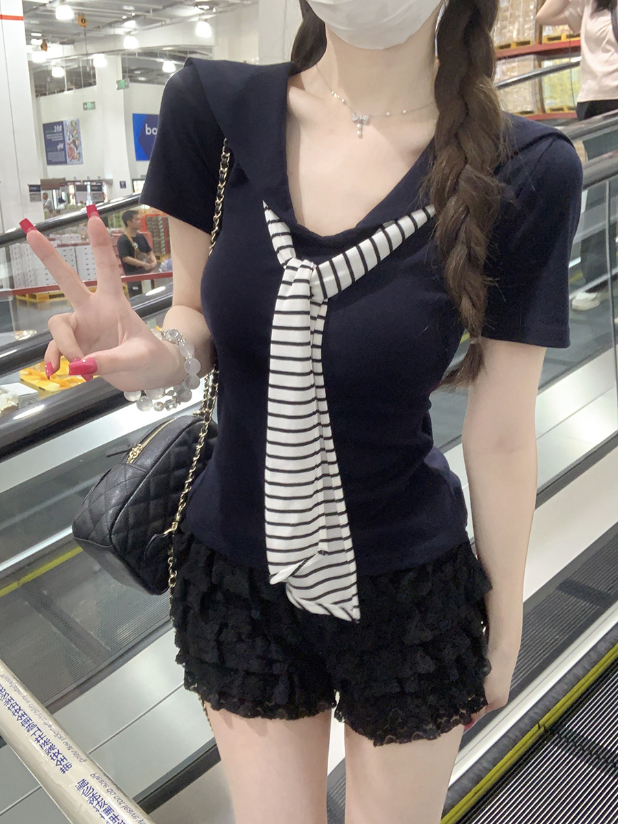学院风ins海军领条纹披肩短袖T恤女夏季2025新款修身显瘦打底上衣
