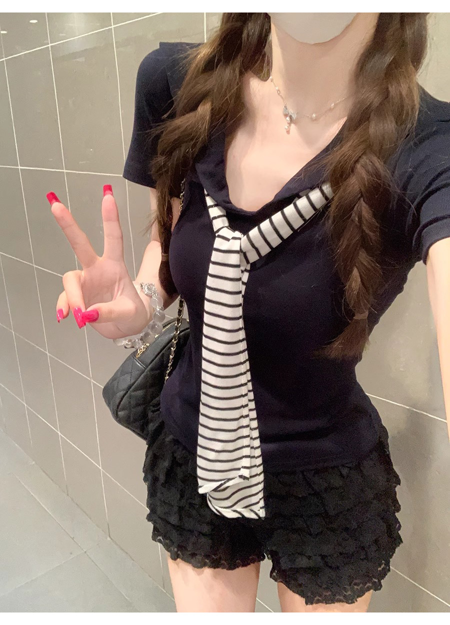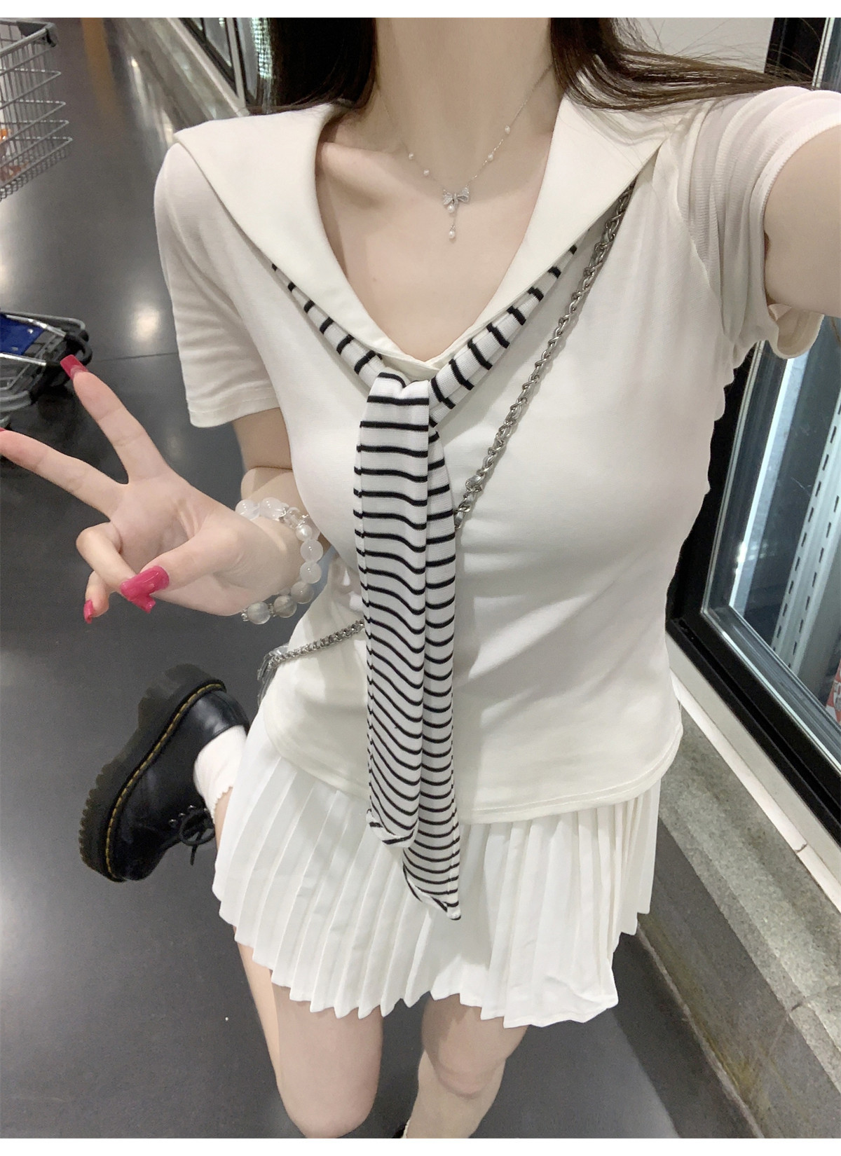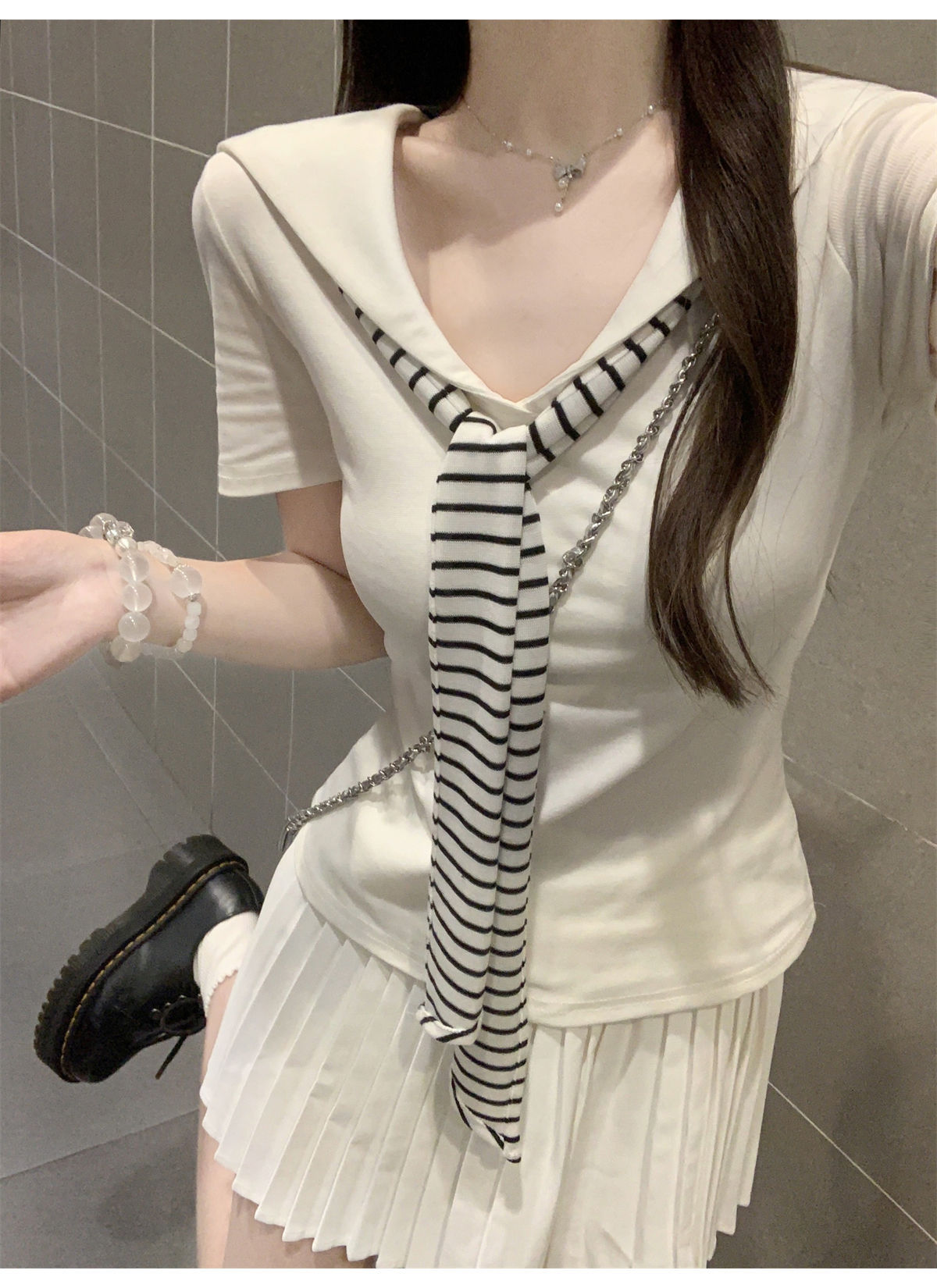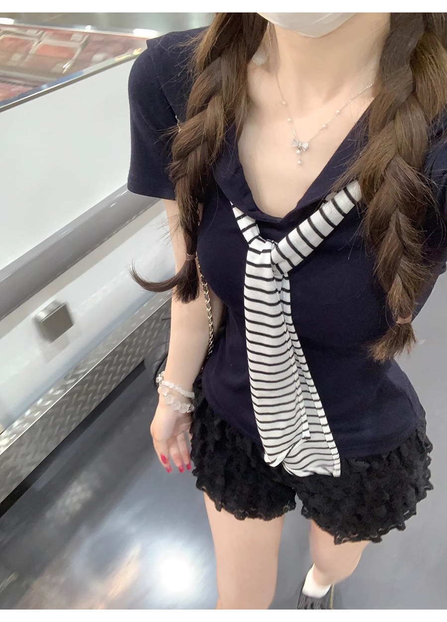 学院风ins海军领条纹披肩短袖T恤女夏季2025新款修身显瘦打底上衣