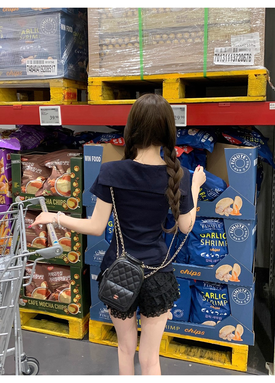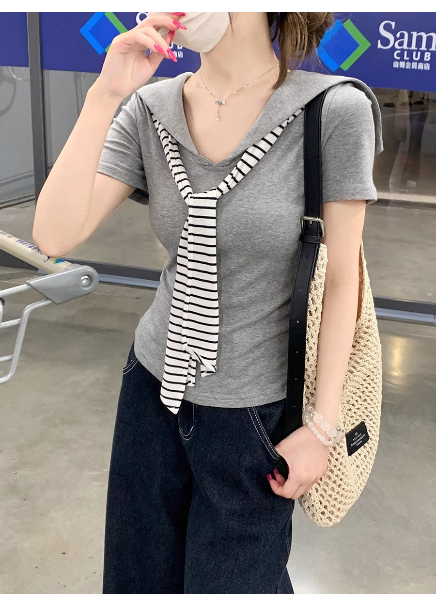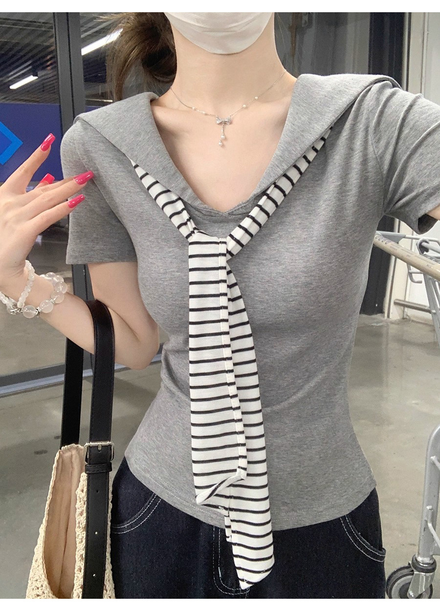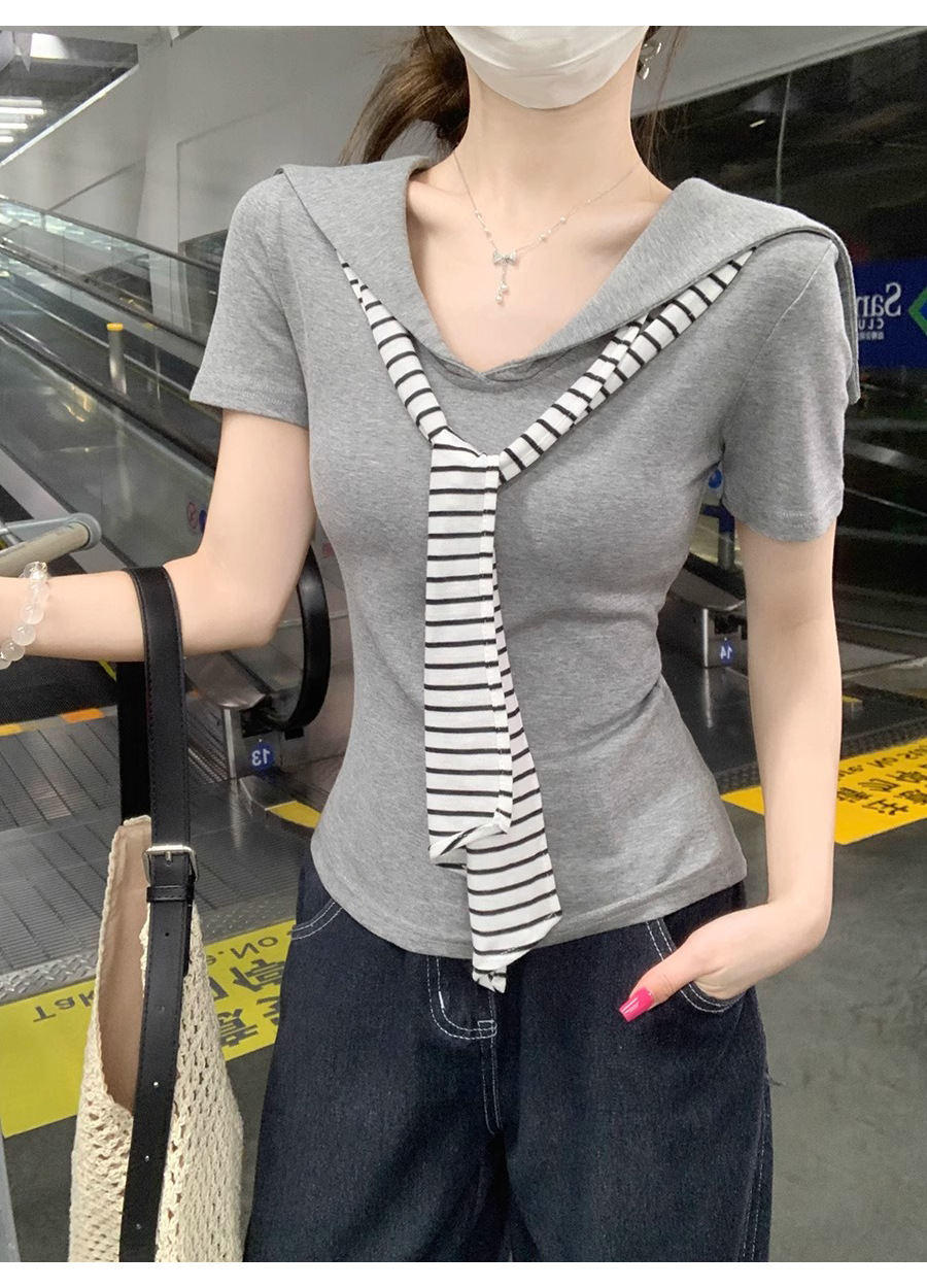 学院风ins海军领条纹披肩短袖T恤女夏季2025新款修身显瘦打底上衣