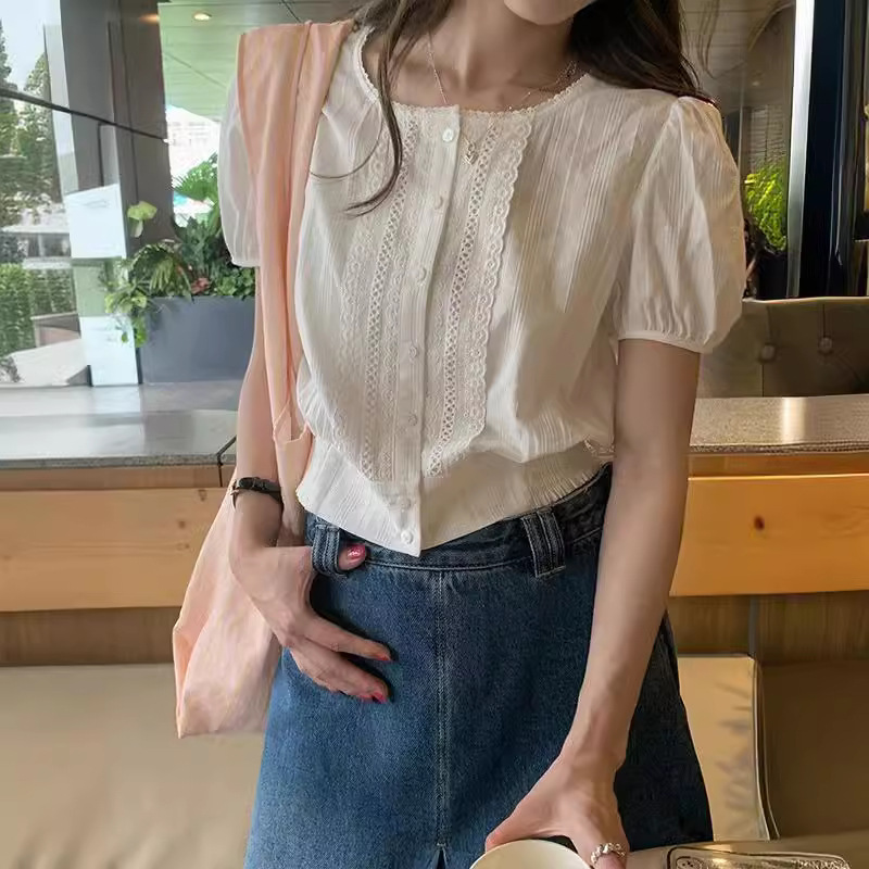 奶乖韩妹白色短袖衬衫女夏季小众设计感气质泡泡袖衬衣