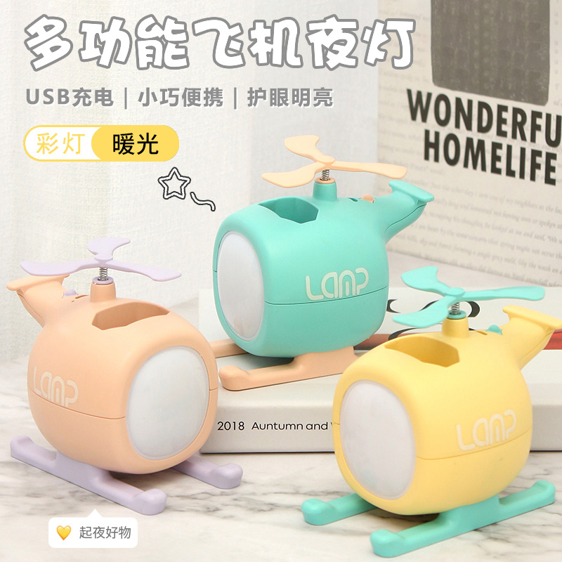 新款多功能飞机小夜灯USB充电卡通笔筒台灯桌面支架手持照明灯
