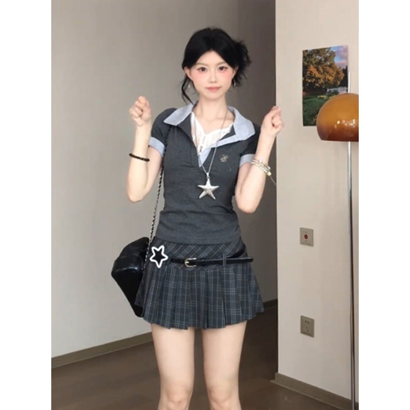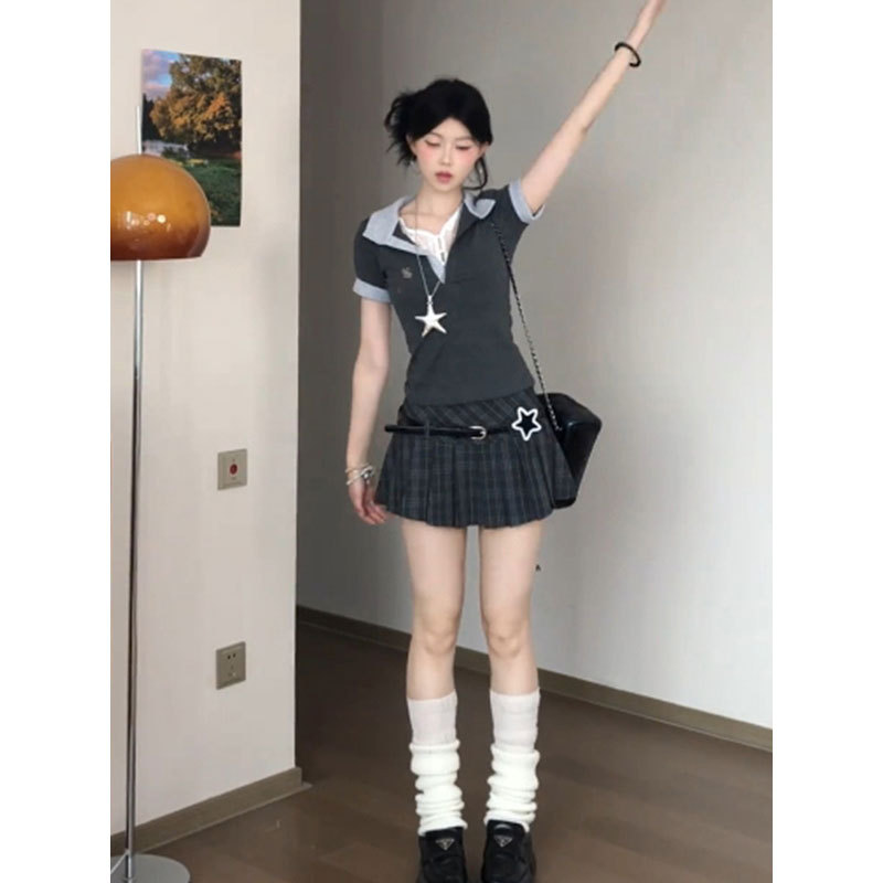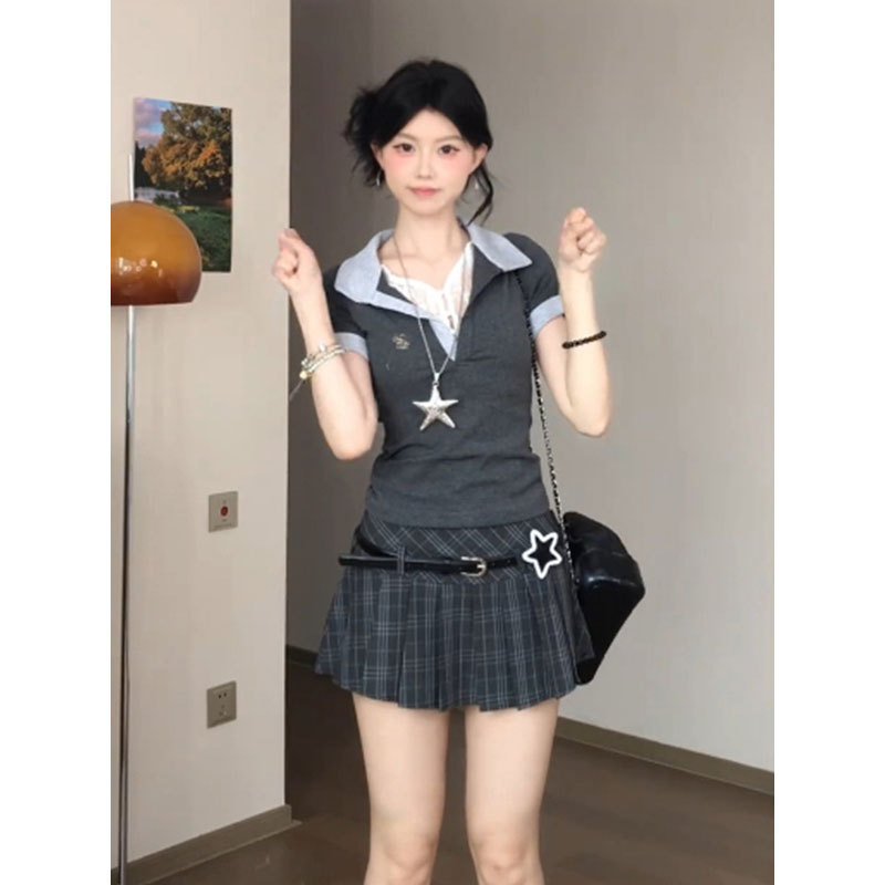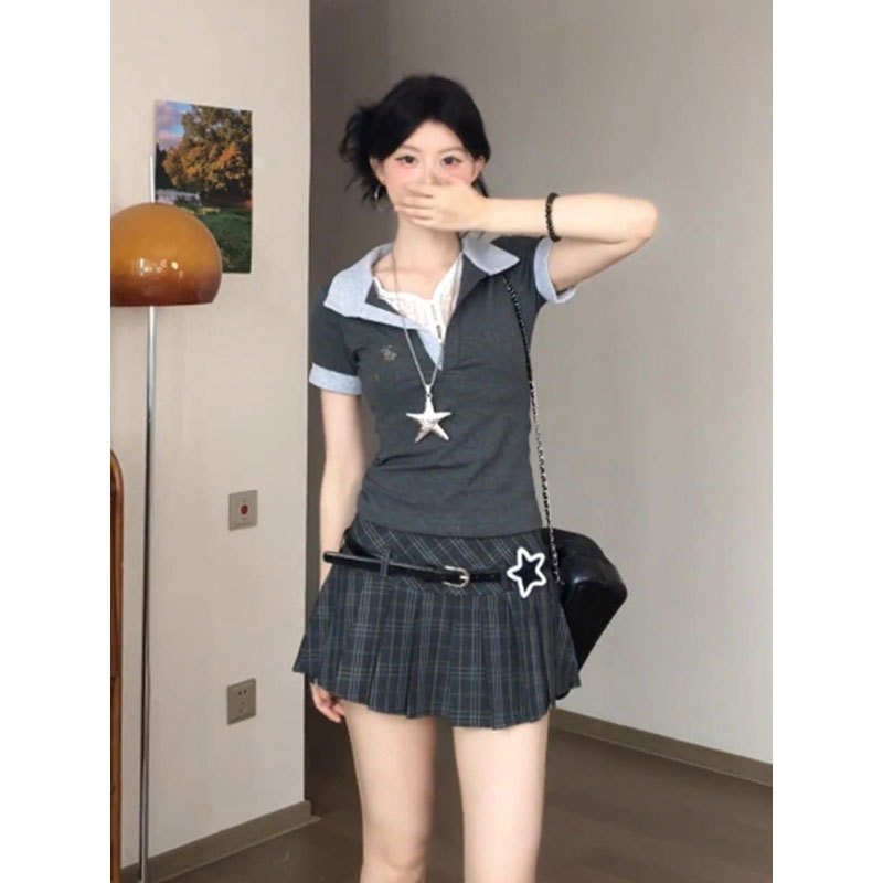 韩版学院风polo领撞色拼接短袖t恤百褶短裙两件套女夏季新款套装
