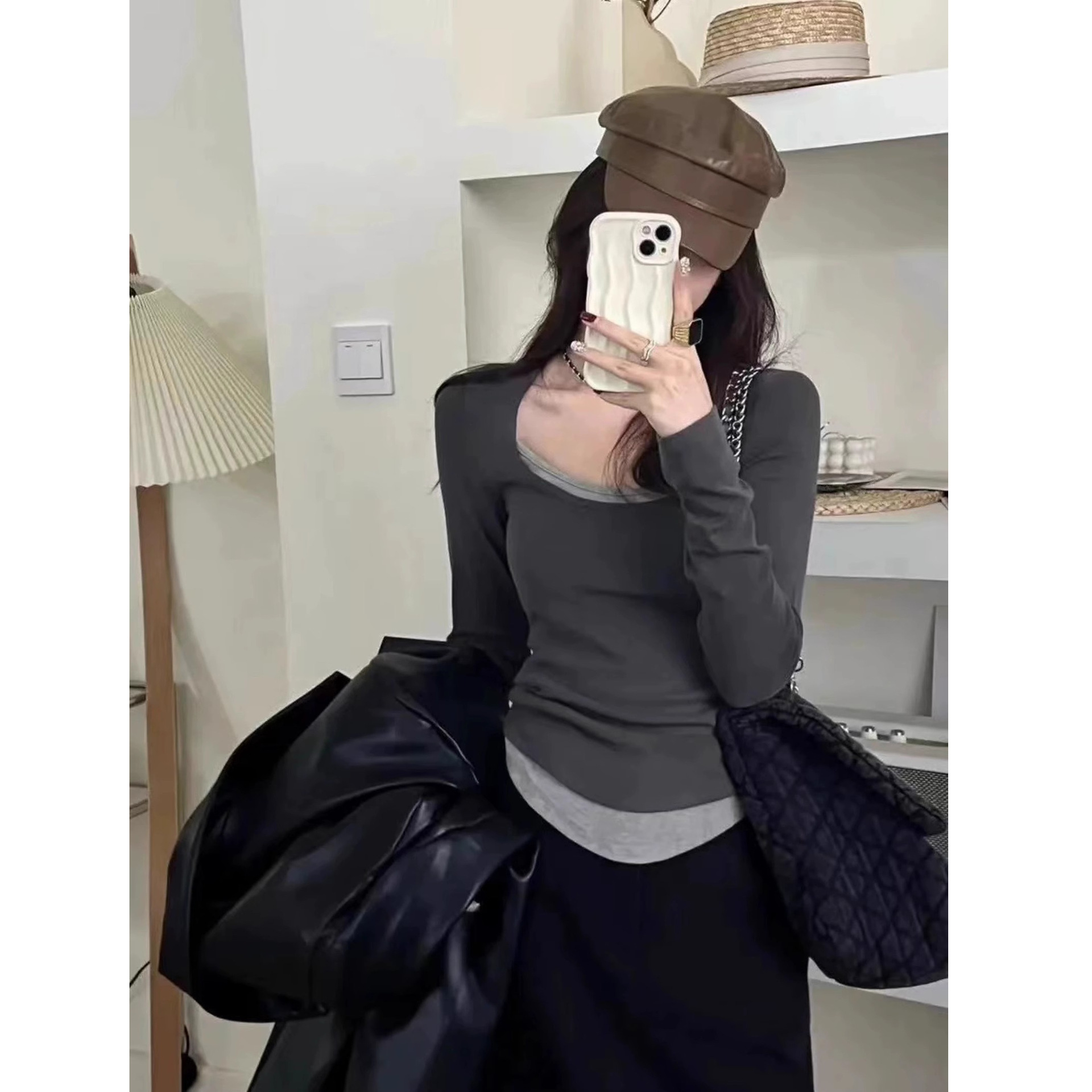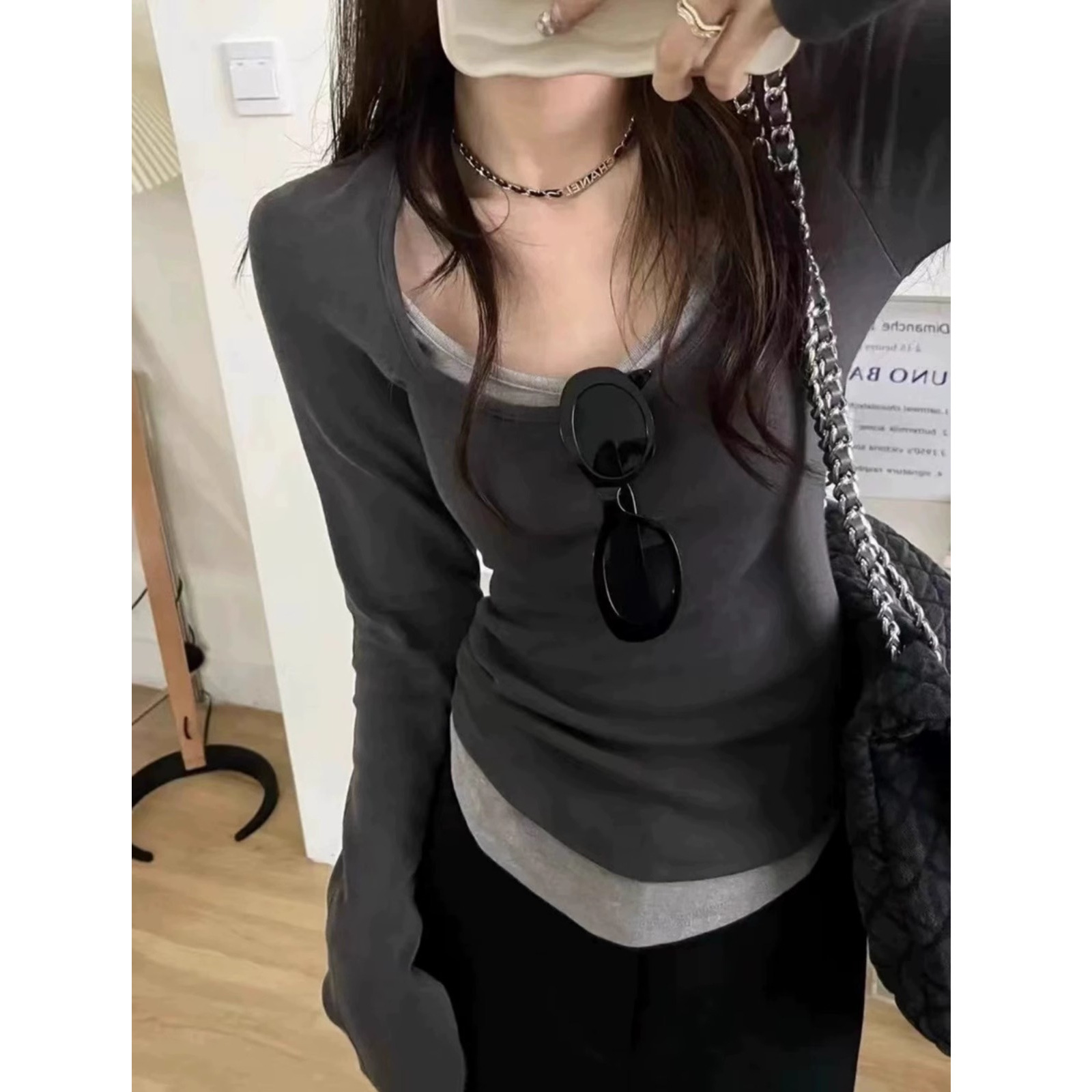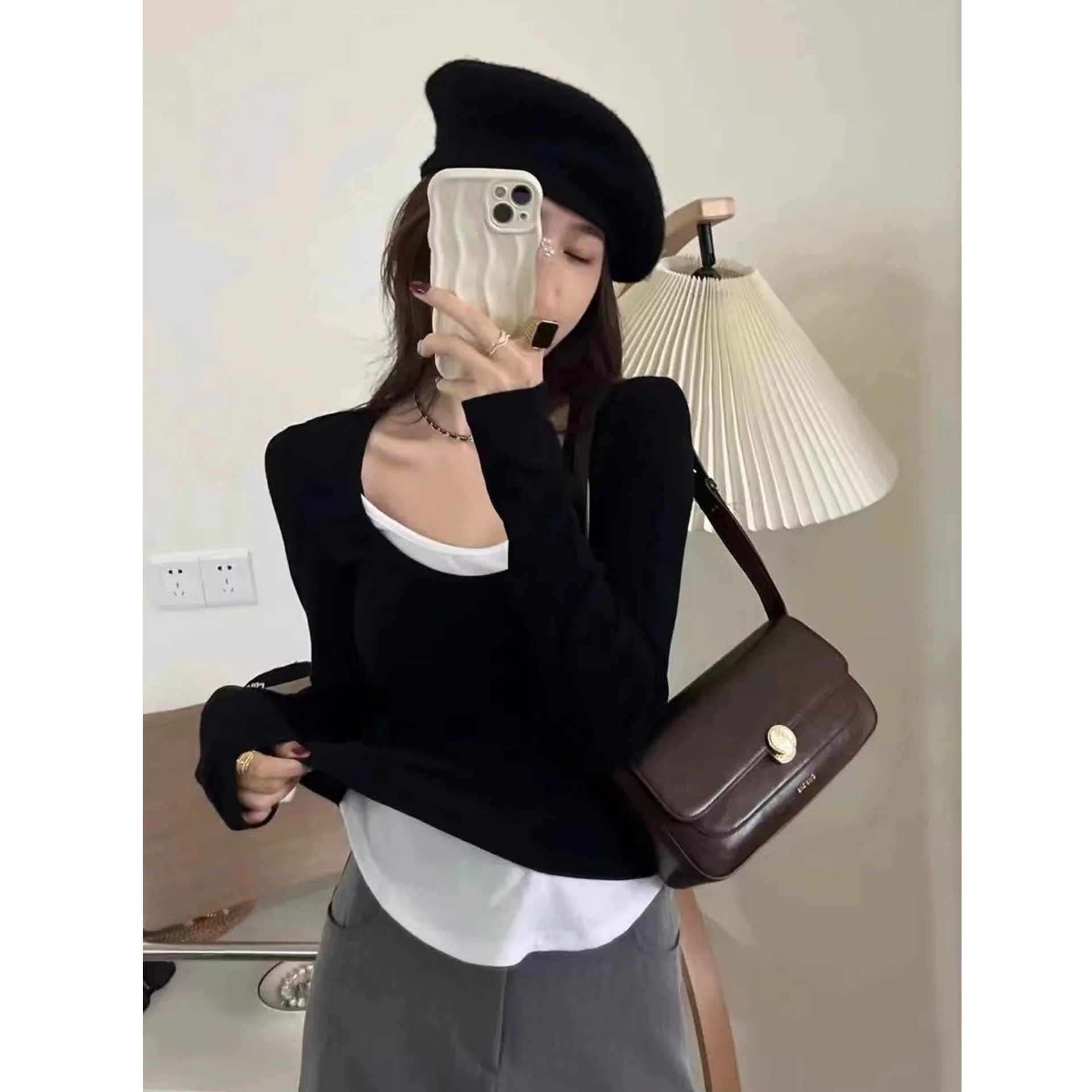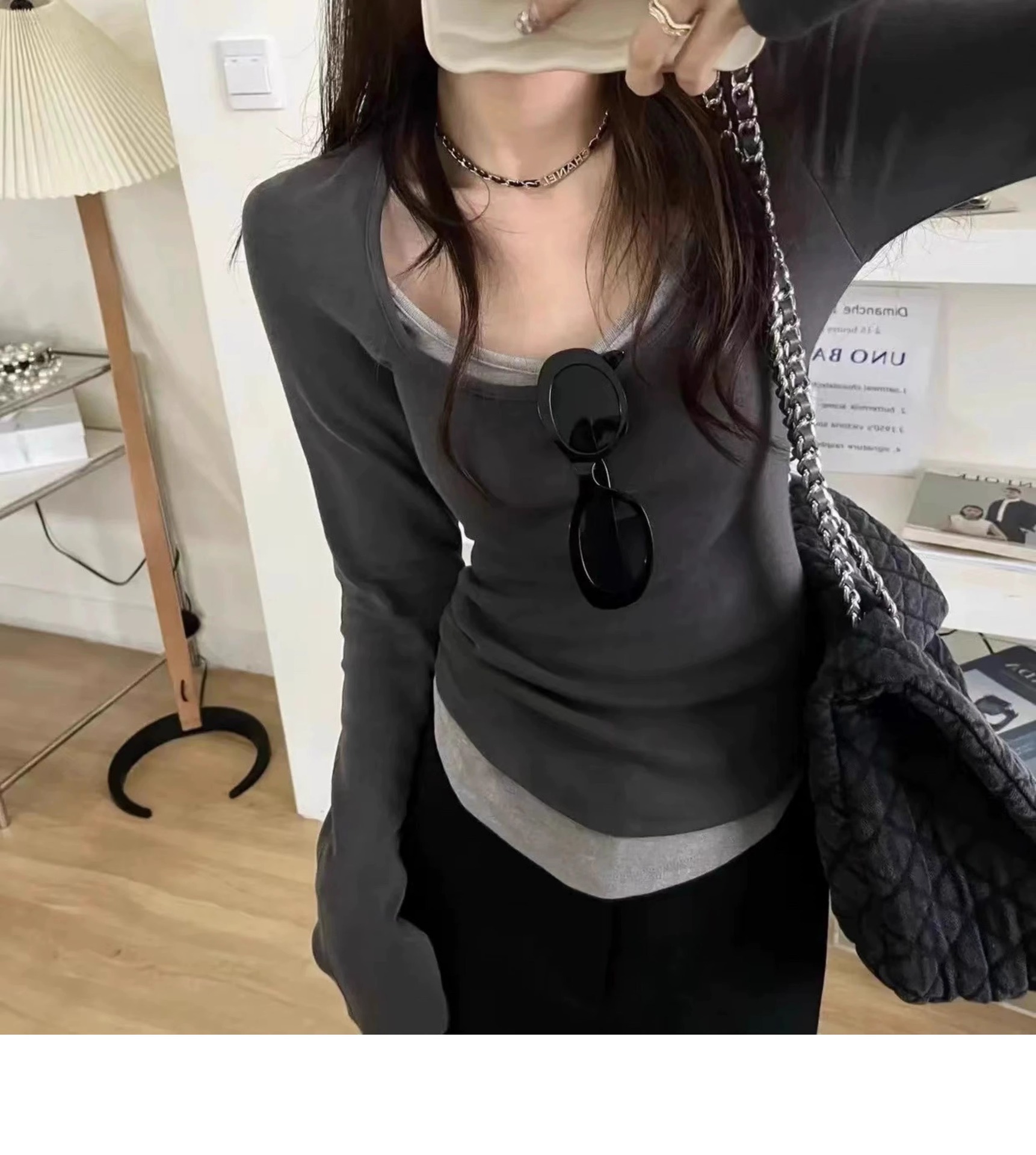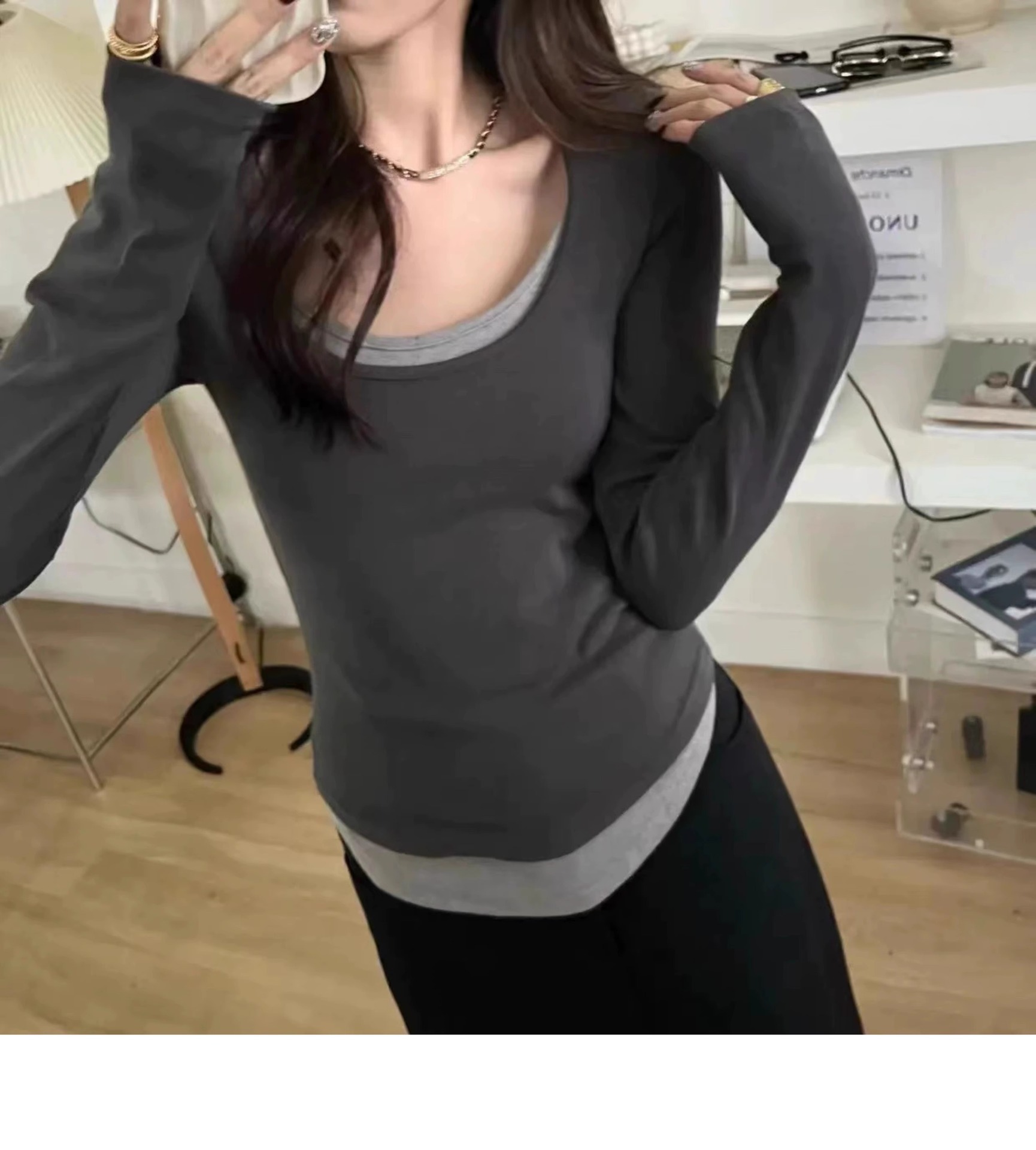 黑白拼接假两件T恤女甜辣修身短款上衣春秋季低U领长袖内搭打底衫