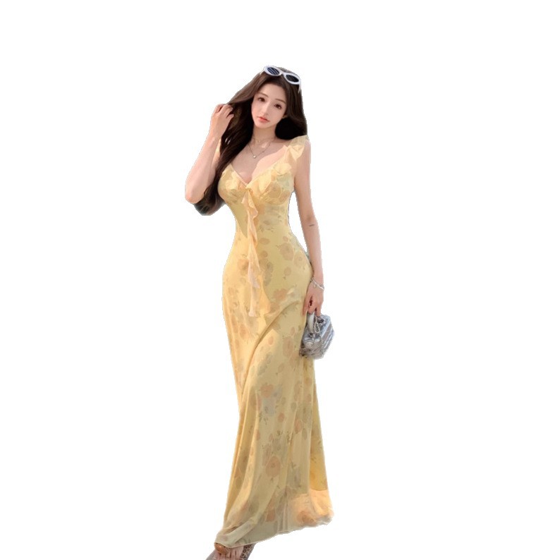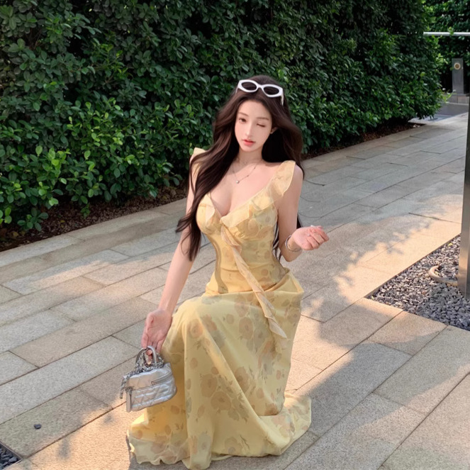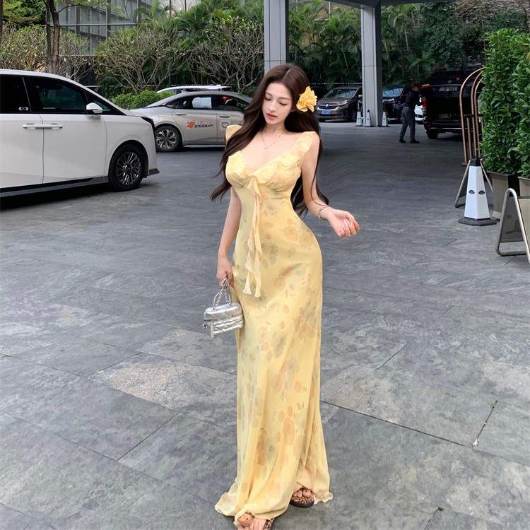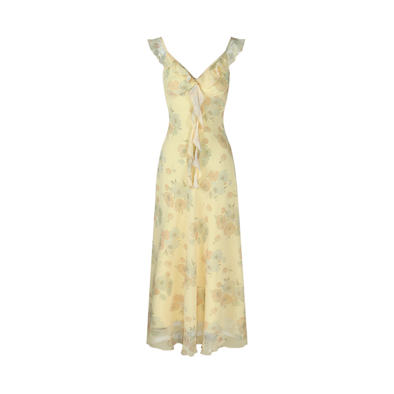 黄色印花吊带连衣裙女夏季法式荷叶边小飞袖裙子收腰气质仙气长裙