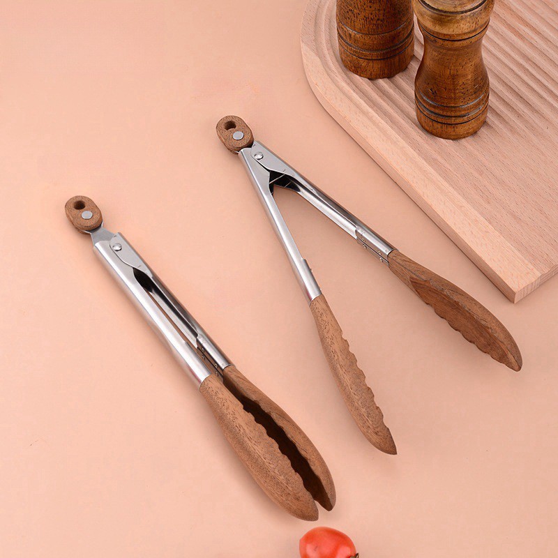 胡桃木食物夹不锈钢食品夹9寸 7寸烧烤夹烤肉夹梅花头