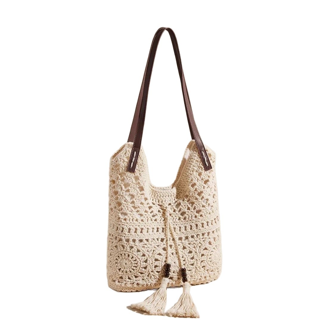 夏流苏棉线单肩草编包镂空针织编织包休闲复古沙滩包时尚女包