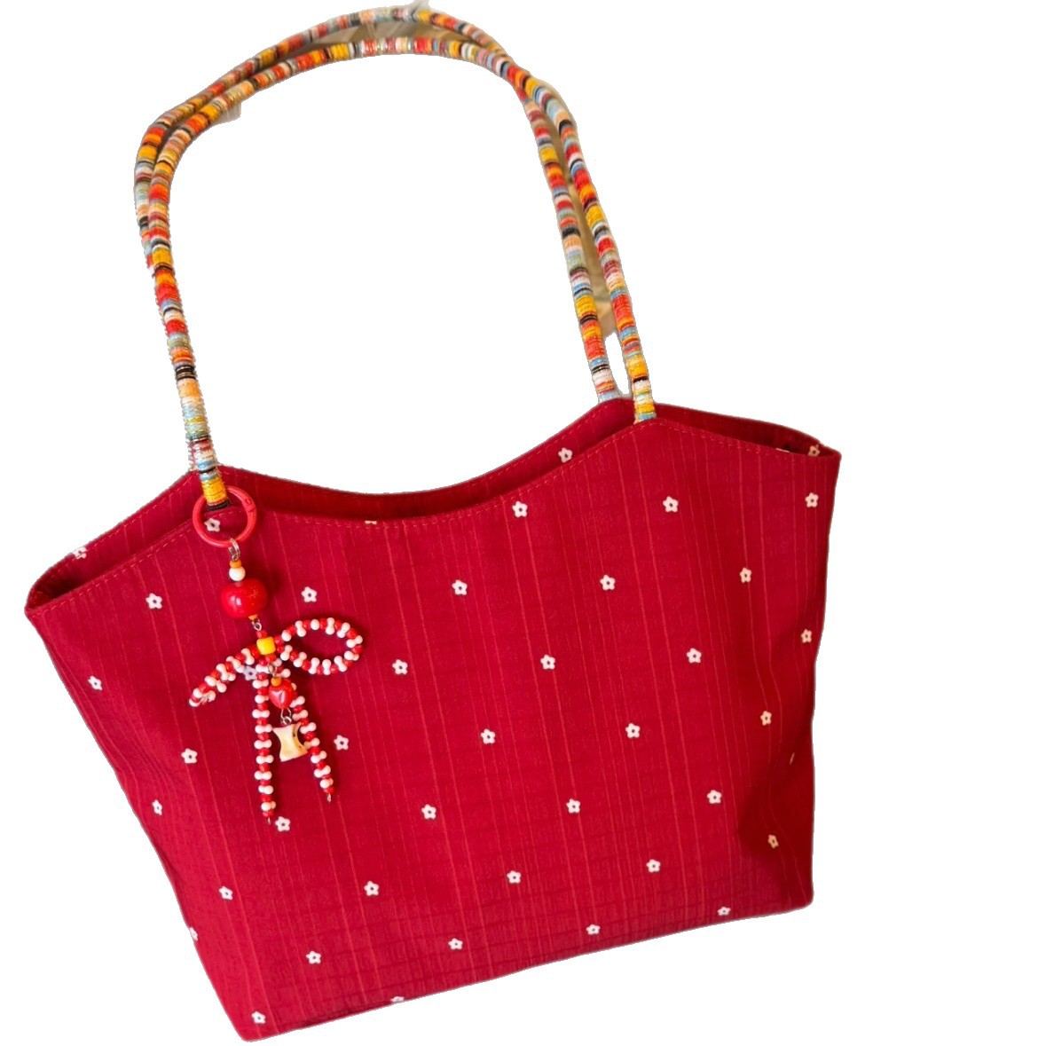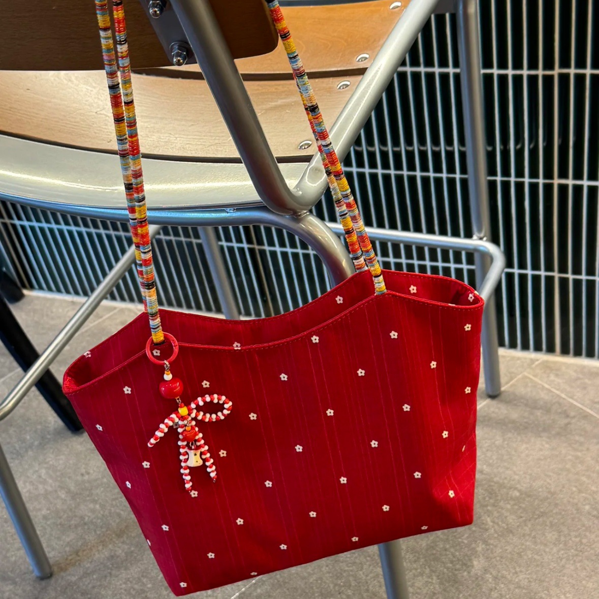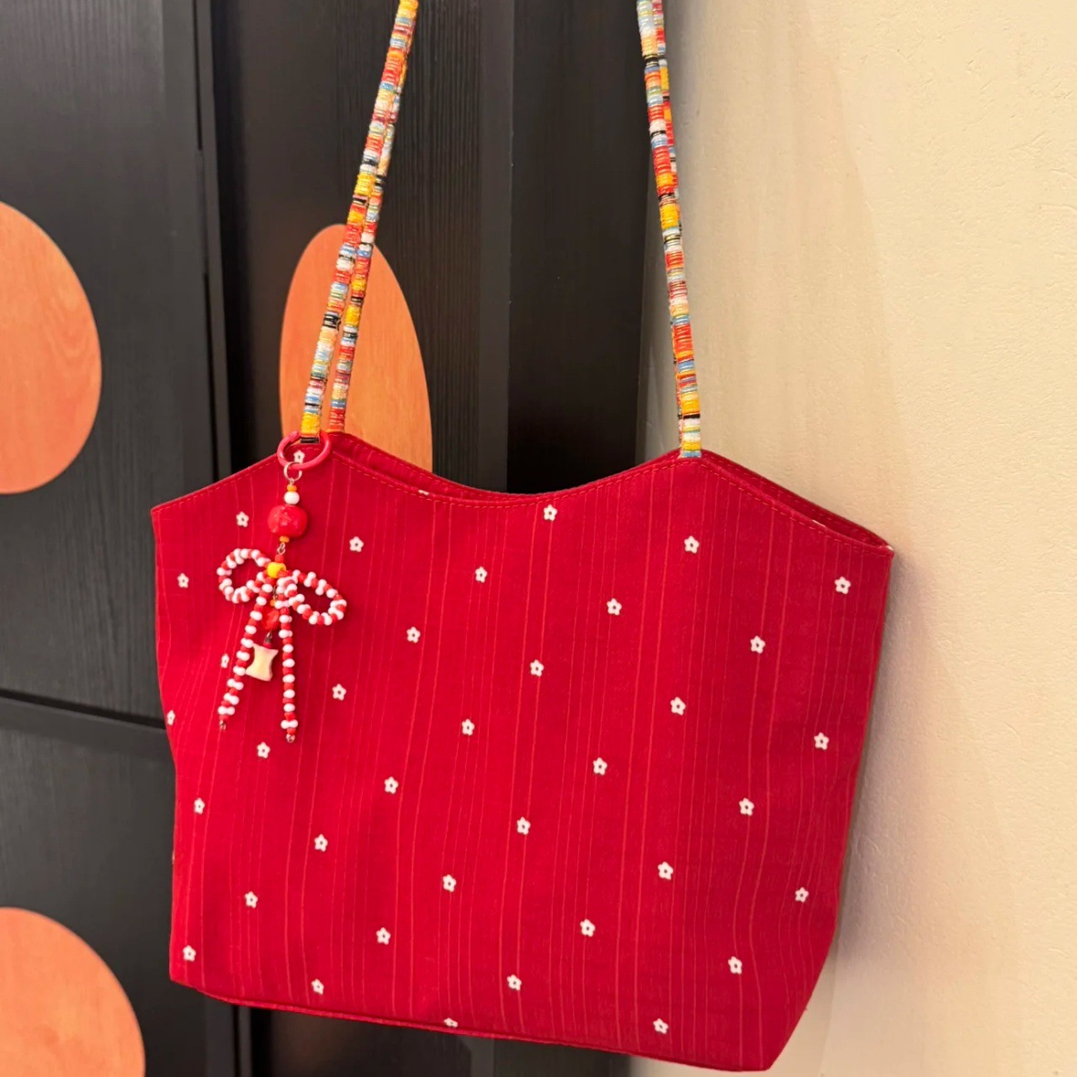 韩系红色花朵帆布包女2025新款撞色编织单肩托特包通勤手提