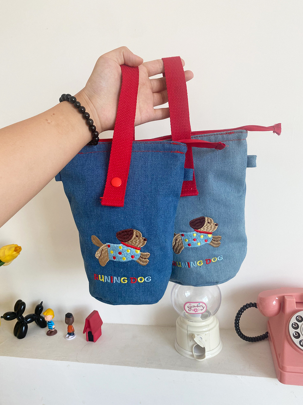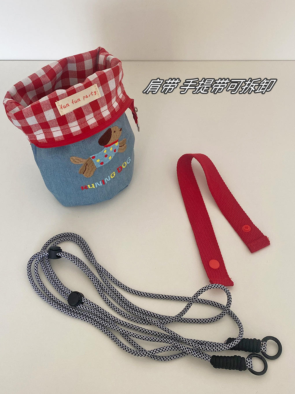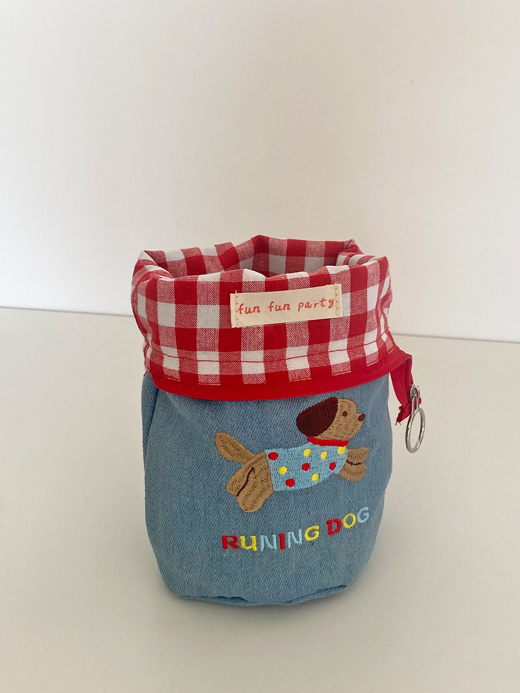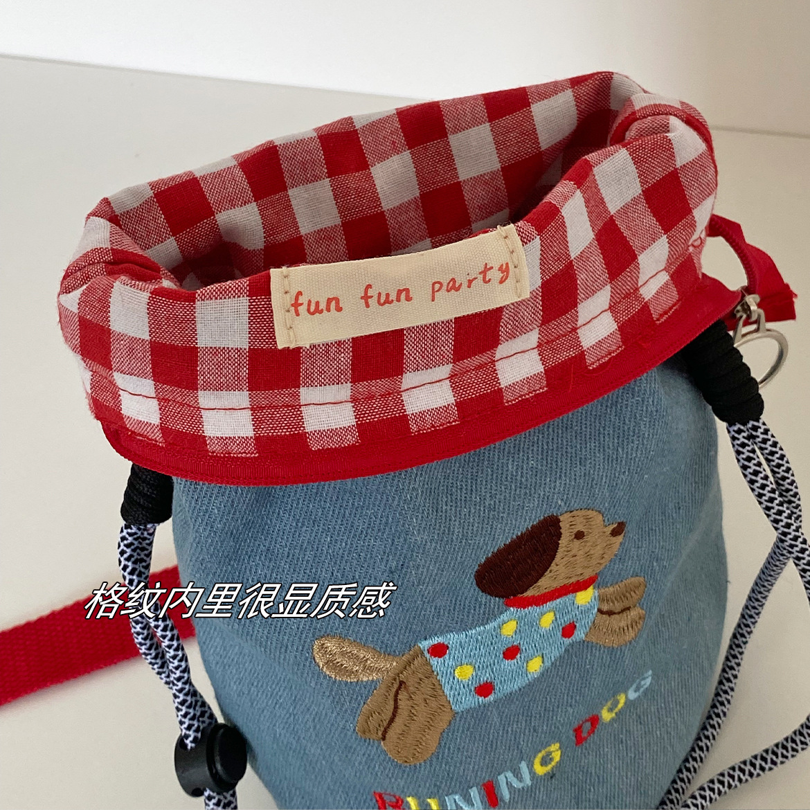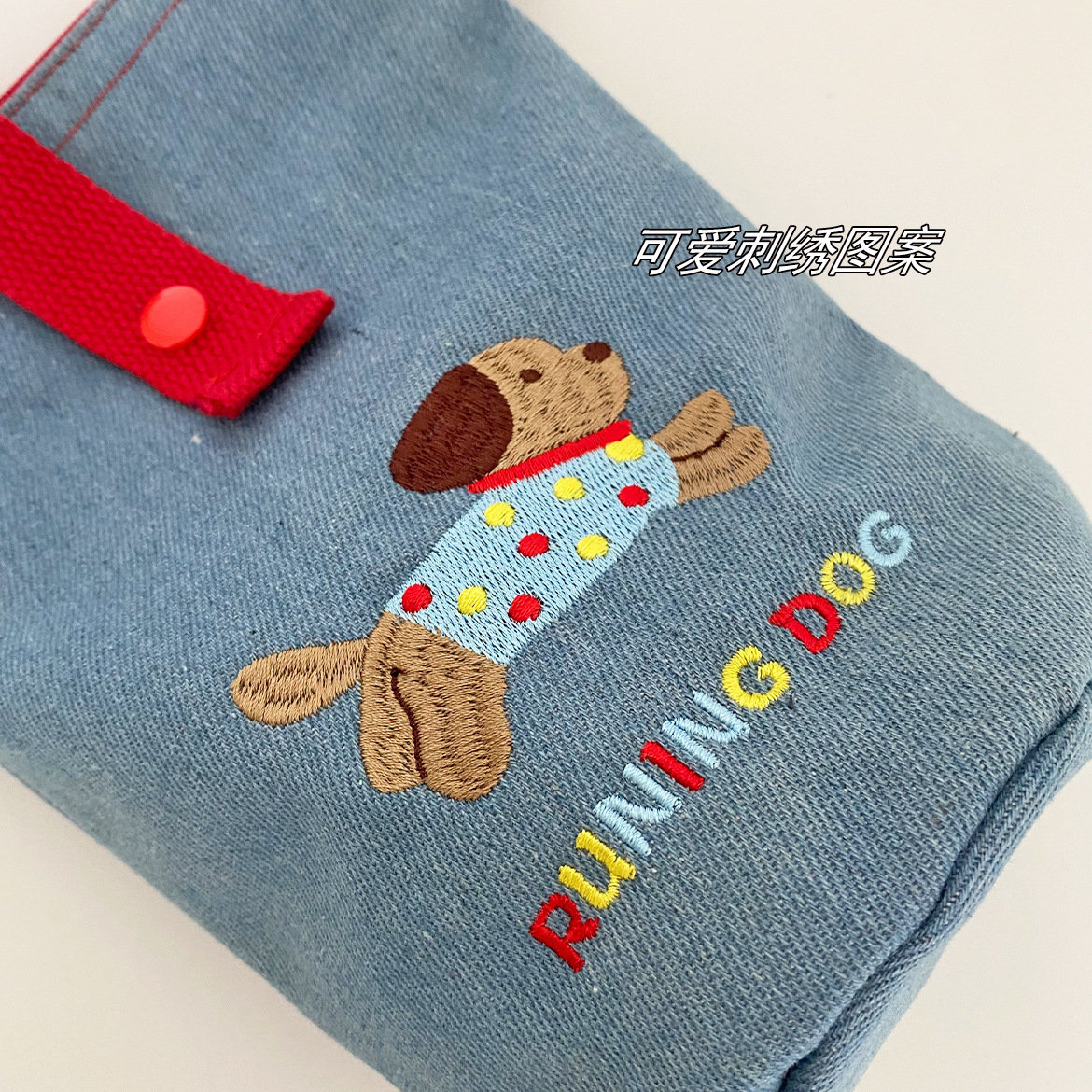 可爱小狗刺绣手机包化妆品收纳包撞色牛仔格子笔袋便携斜挎小包女