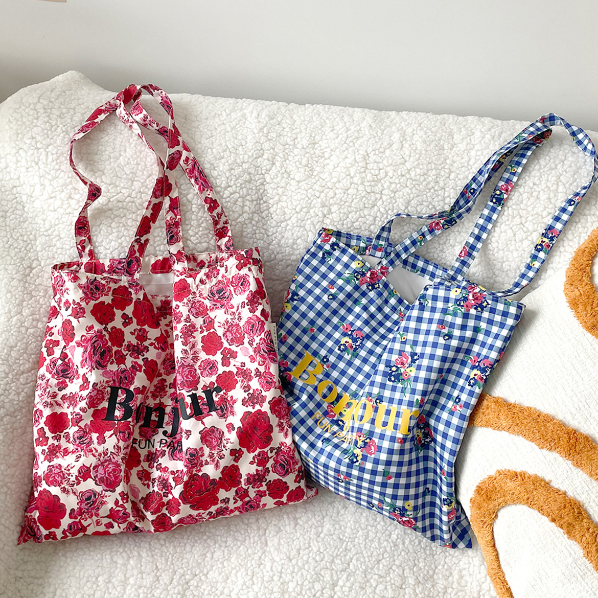 韩国ins风帆布袋蓝格纹单肩包复合碎花包大容量帆布包通勤托特包