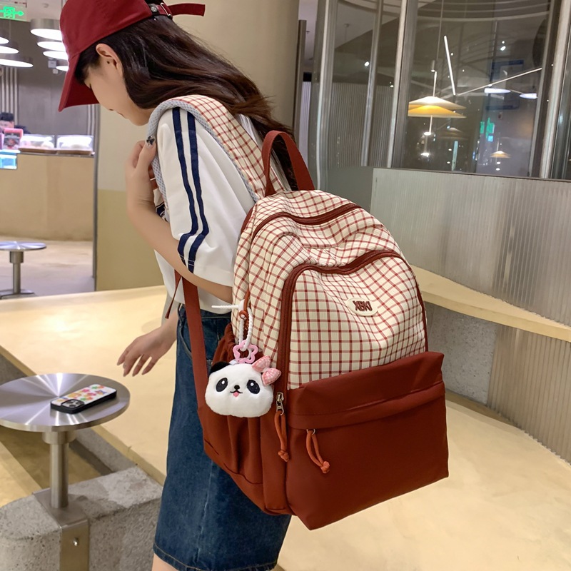 格子双肩包小众 初中女生高中书包女大容量旅行背包