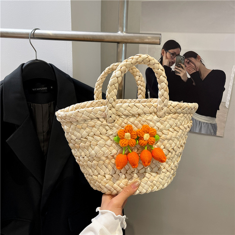 时尚可爱菜篮子包包女2025夏季休闲可爱针织花朵挂件编织手提包女