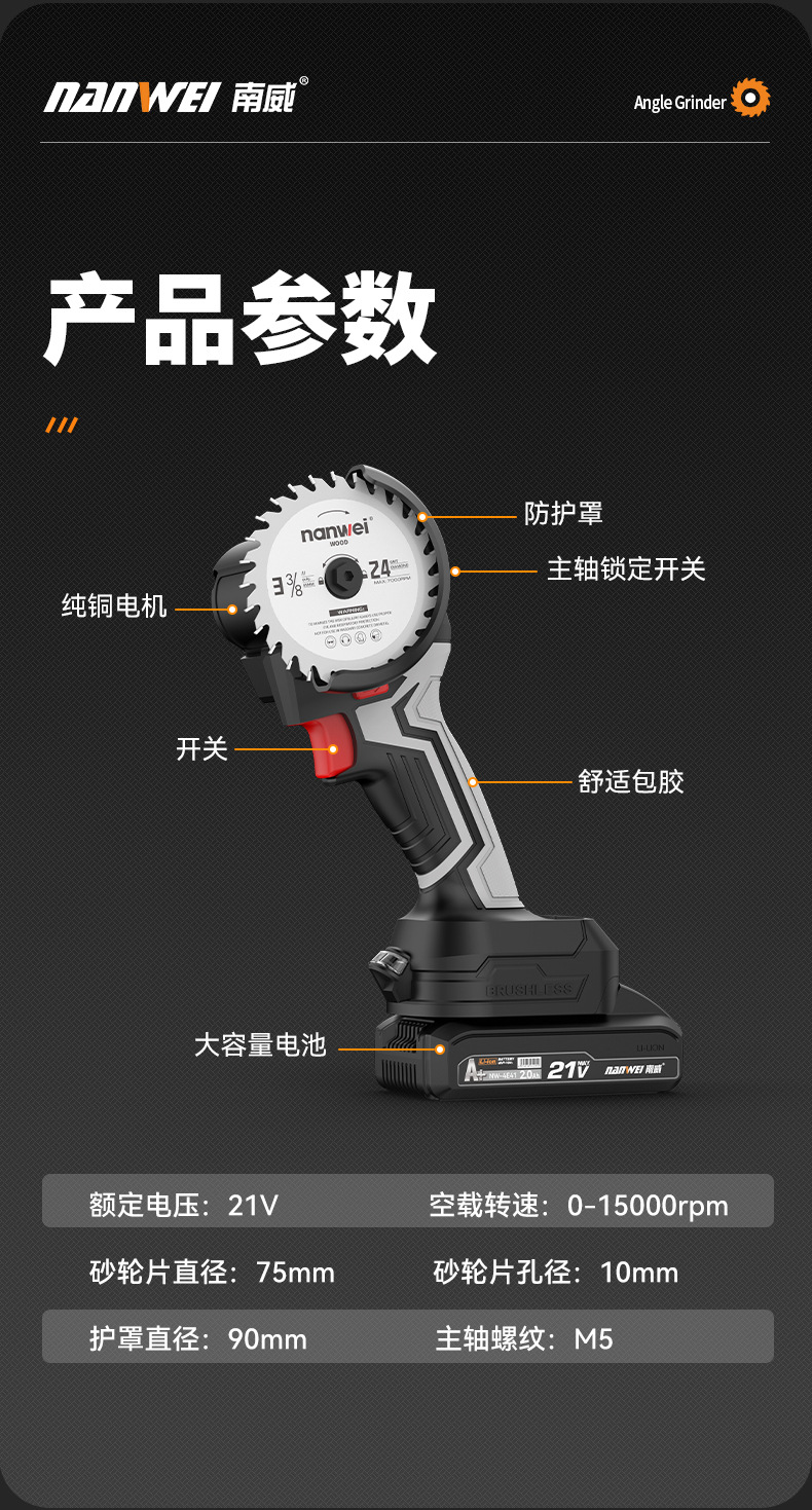- 【骑士系列】21v无刷3寸角磨机2.5AH两电一充+金属切割套餐