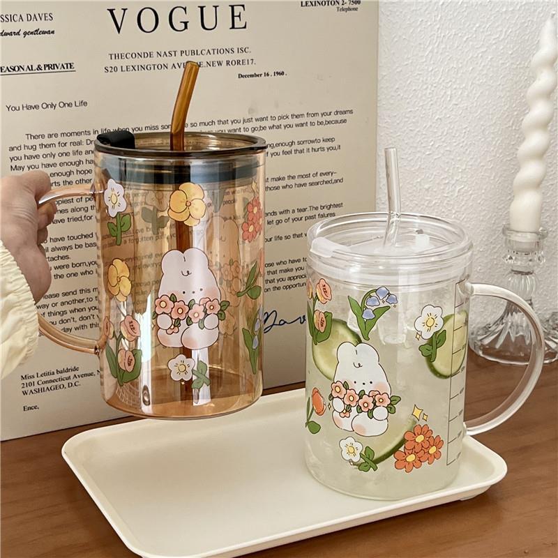 韩国ins高颜值少女带盖大容量玻璃杯耐高温吸管杯办公室喝水杯子