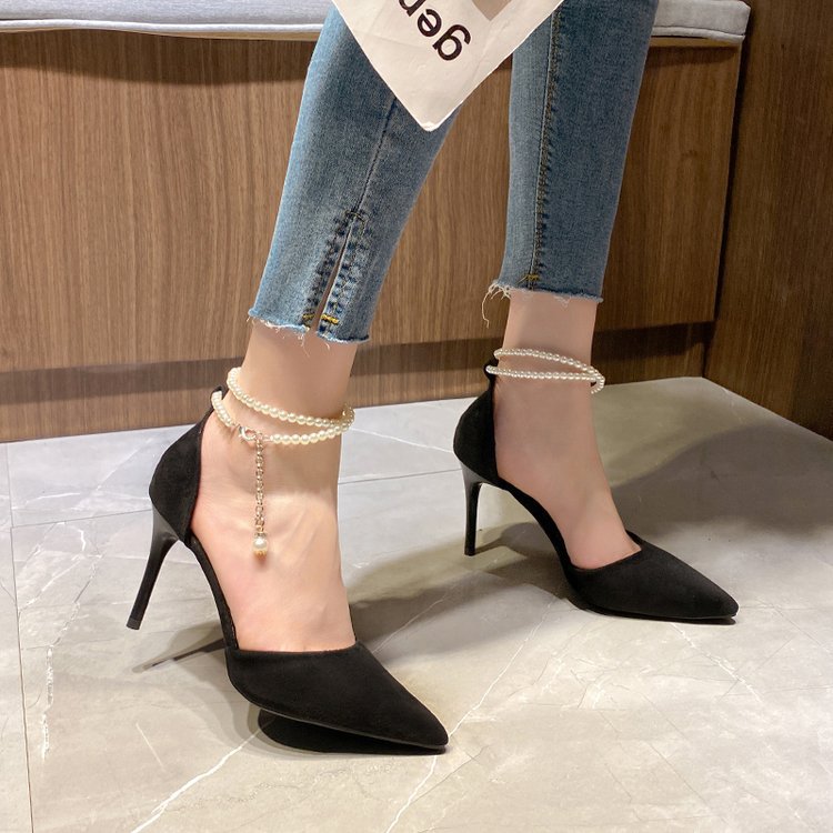 秋季新款细跟单鞋尖头浅口中空高跟鞋珍珠带搭扣时装女鞋