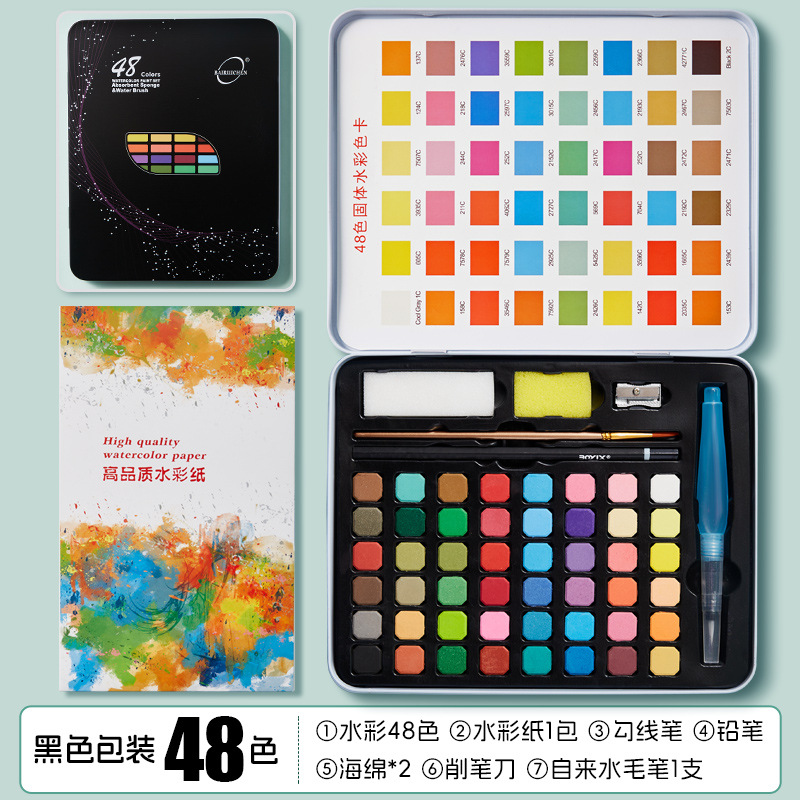 - 黑色铁盒装48色固体水彩