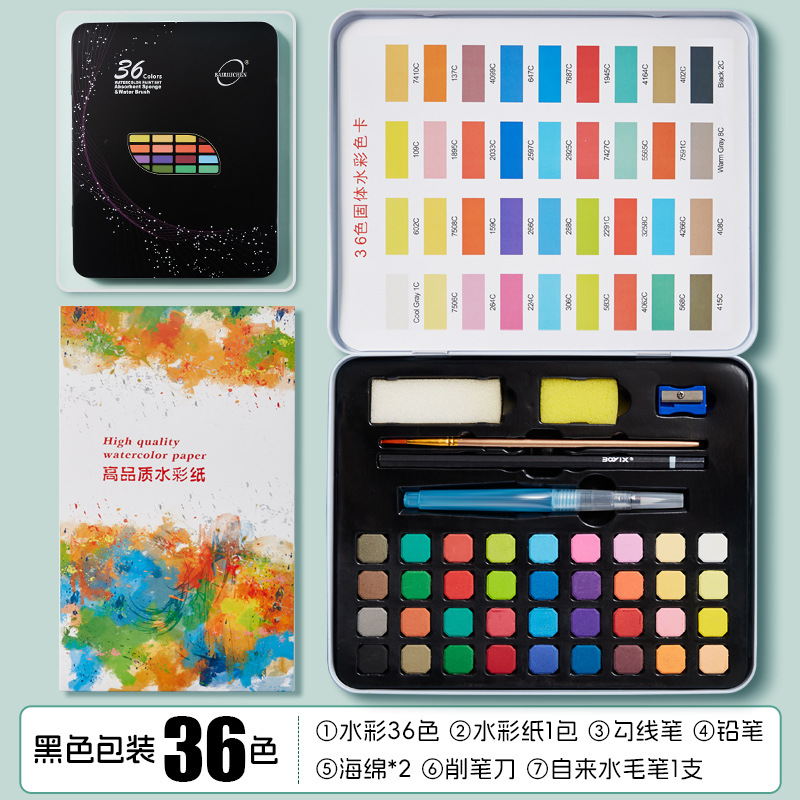 - 黑色铁盒装36色固体水彩