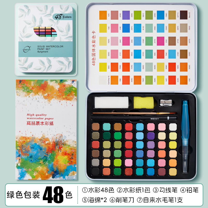 - 绿色铁盒装48色固体水彩