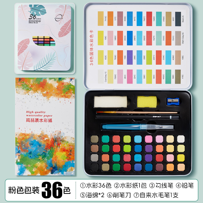 - 粉色铁盒装36色固体水彩