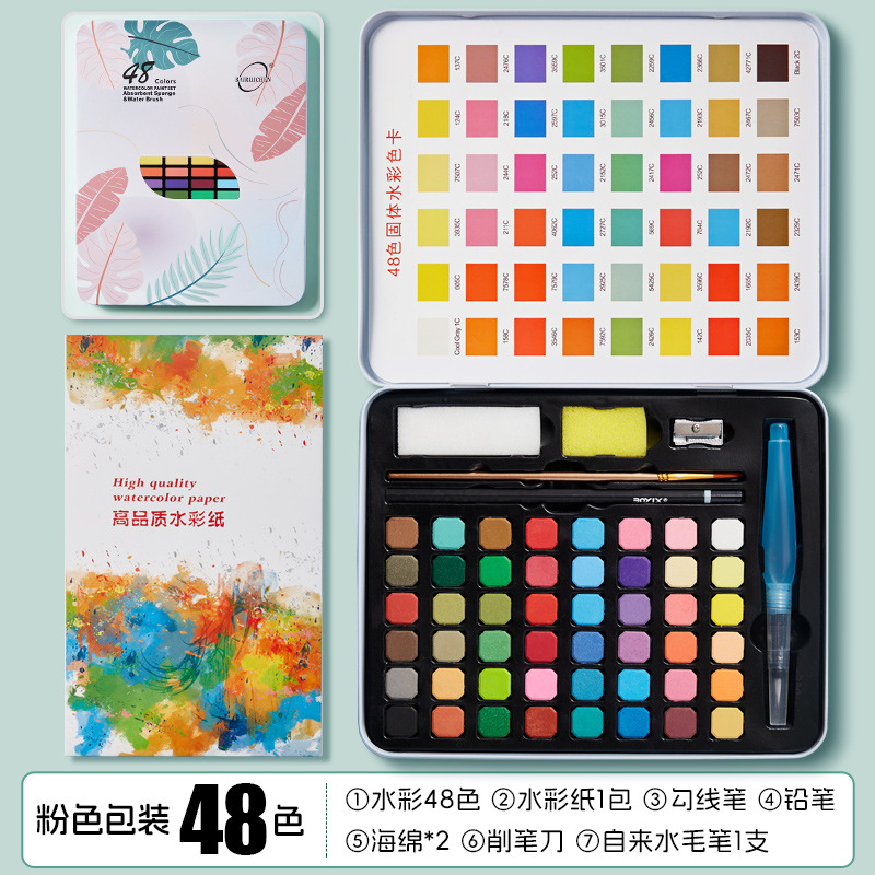 - 粉色铁盒装48色固体水彩
