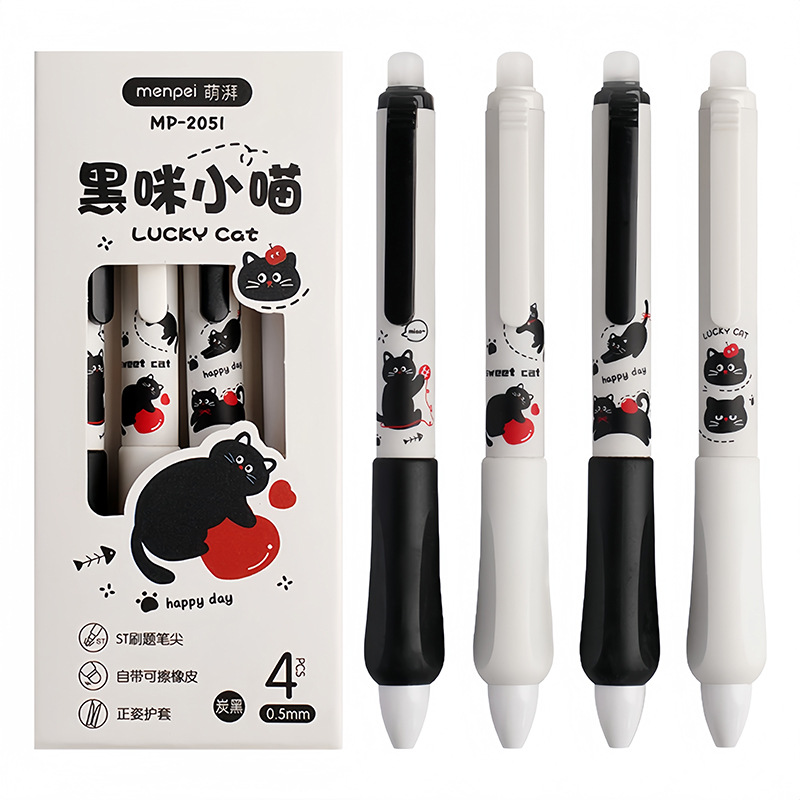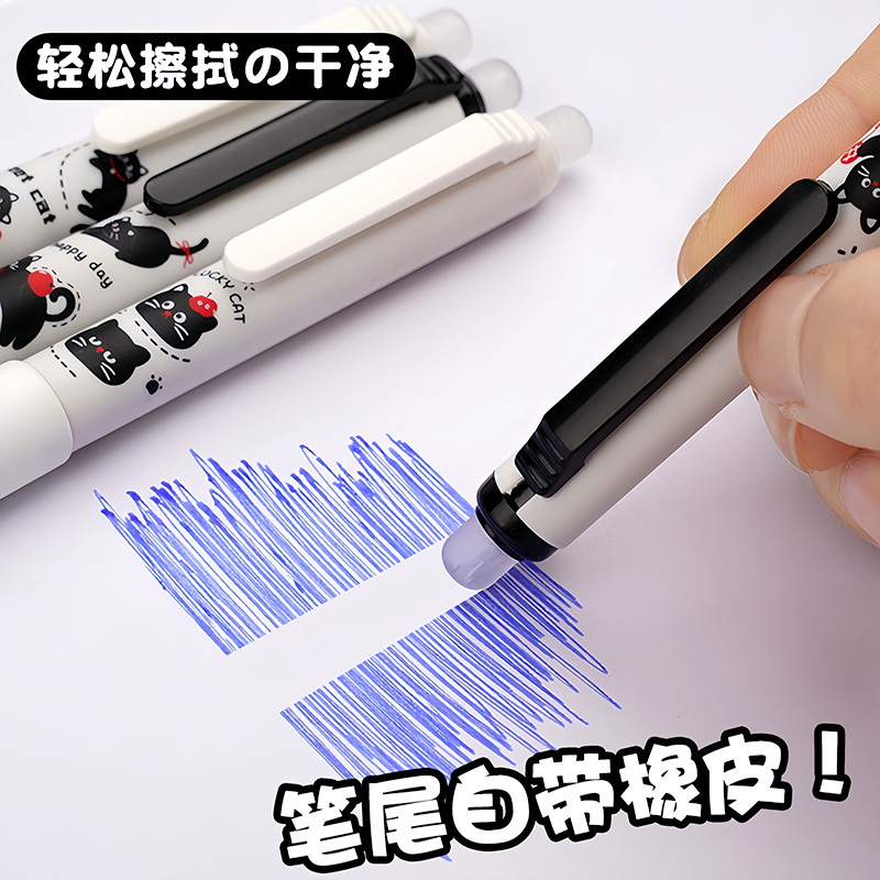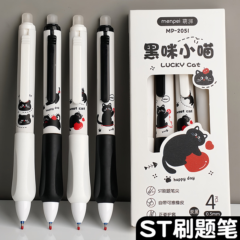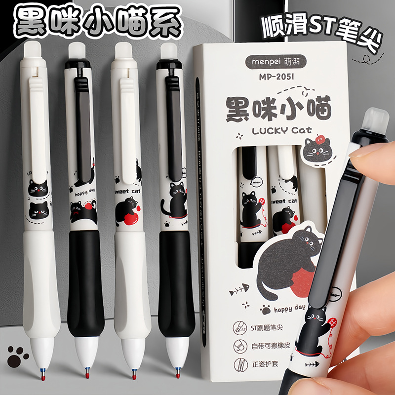 萌湃按动中性可擦笔黑咪小猫高颜值0.5mm小学生文具用品笔