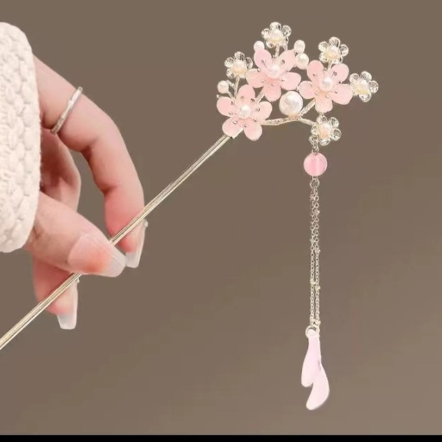 粉色桃花流苏古风发簪简约现代盘发步摇高级感簪子