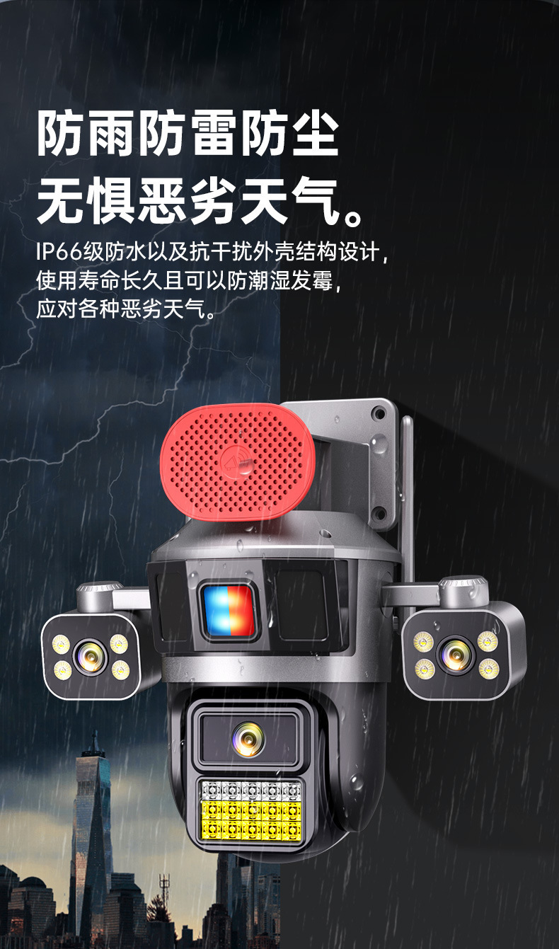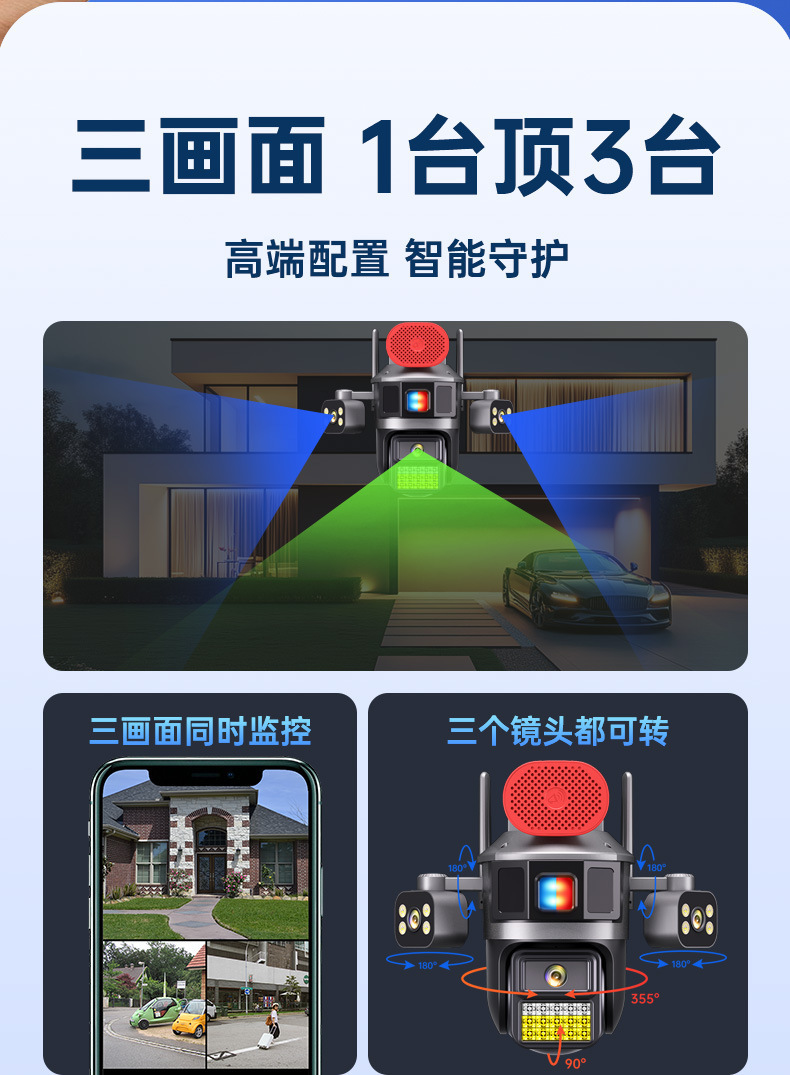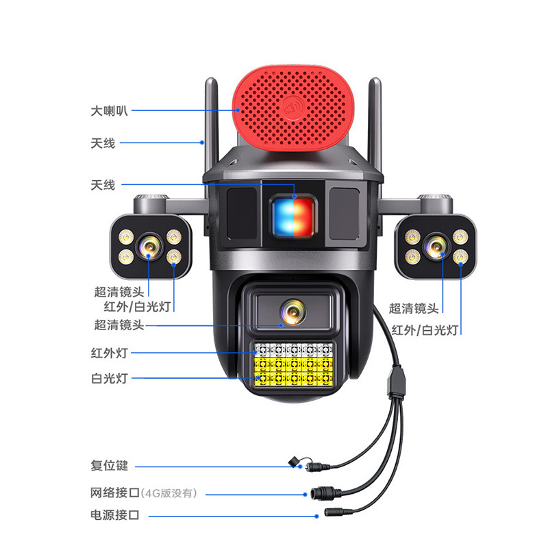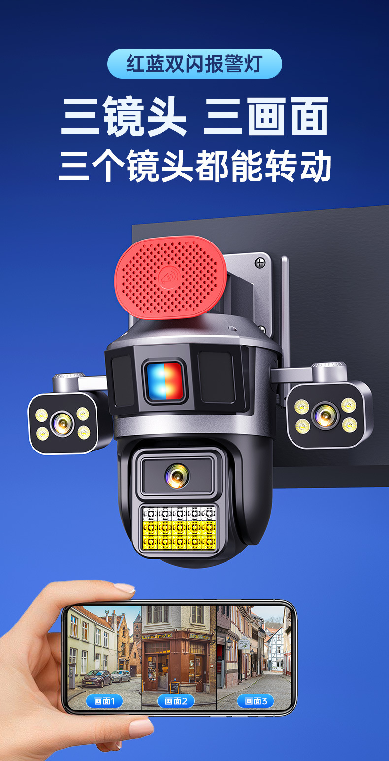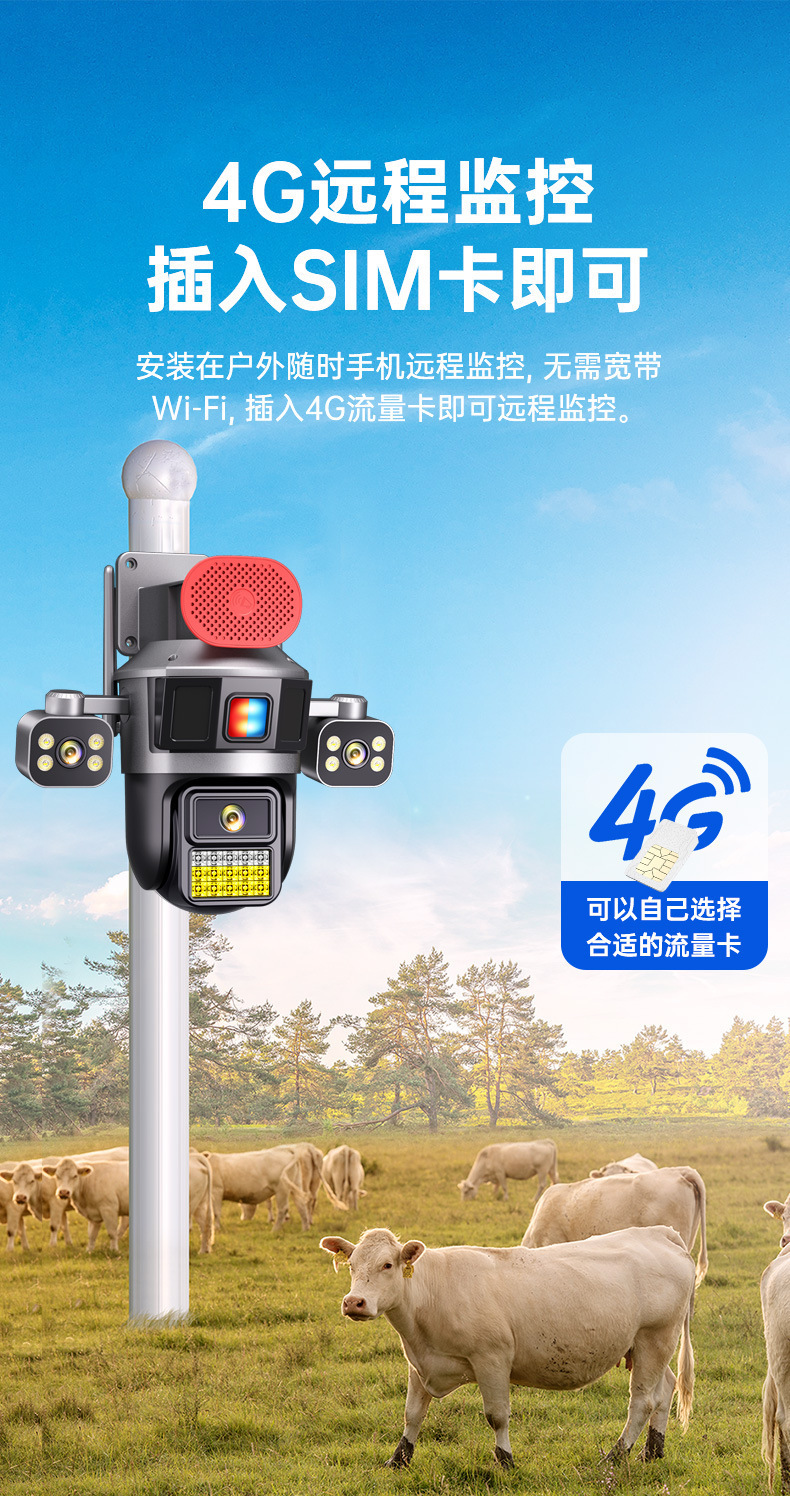 4G流量太阳能摄像机三镜头高清全彩夜双摄像头手机远程360度监控