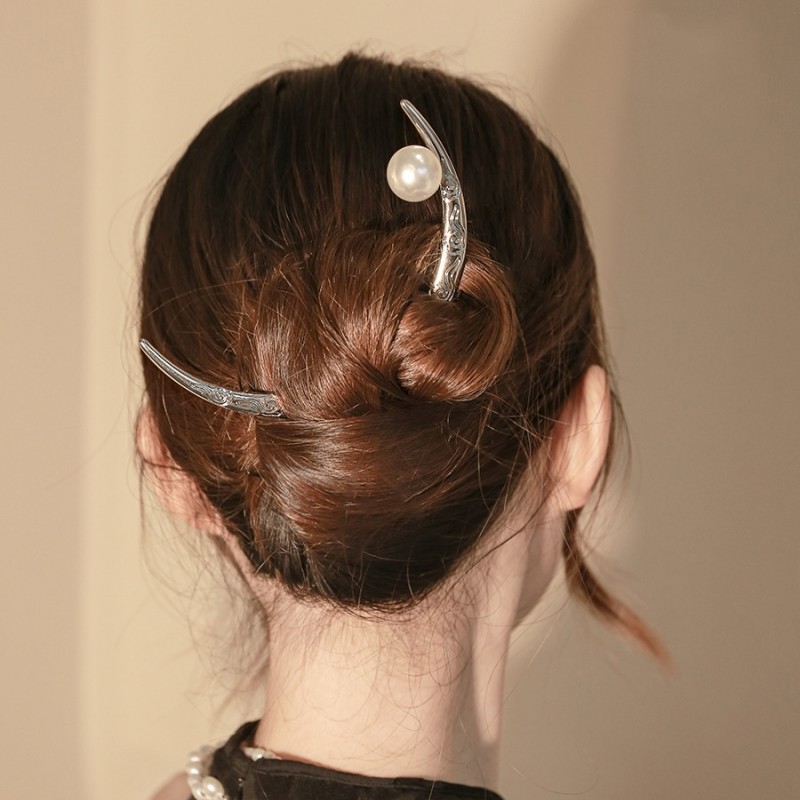 中国风上弦月簪盘发丸子头复古银色珍珠半月挽发簪子女古风发簪