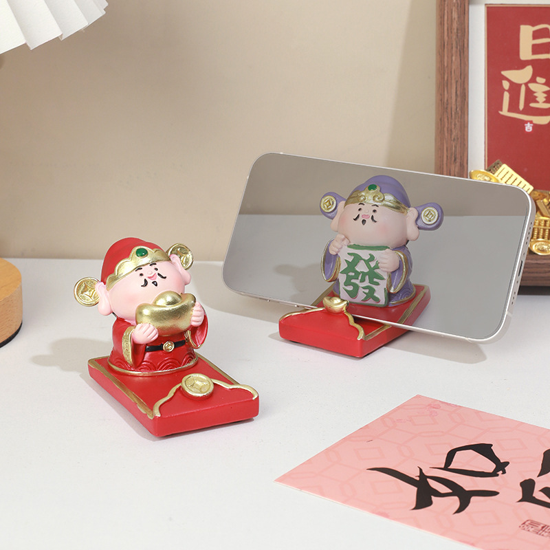 中式喜庆创意财神树脂工艺品桌面手机支架工位神仙摆件