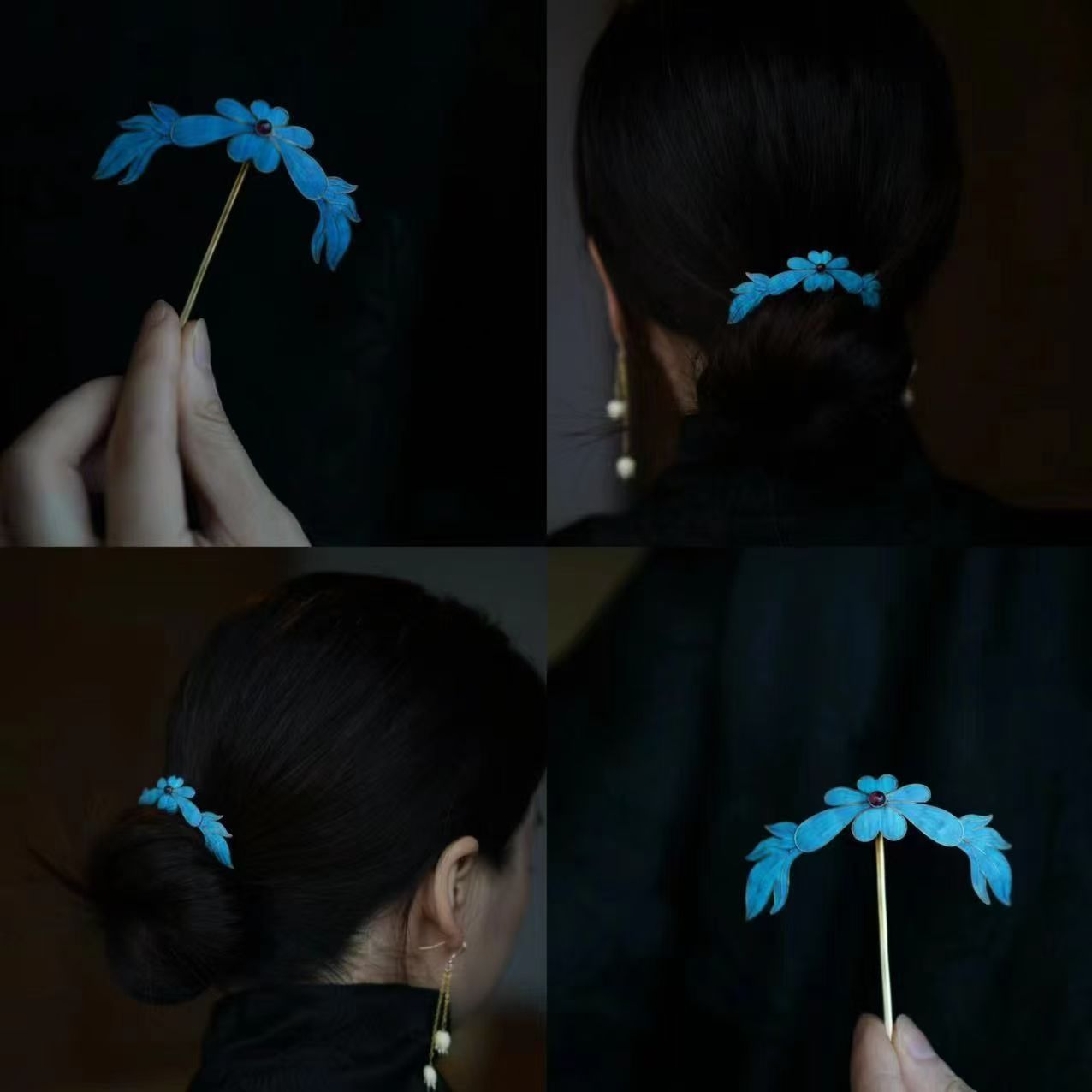 新中式仿点翠花朵发簪烧蓝设计小众设计民族风汉元素复古穿搭配饰