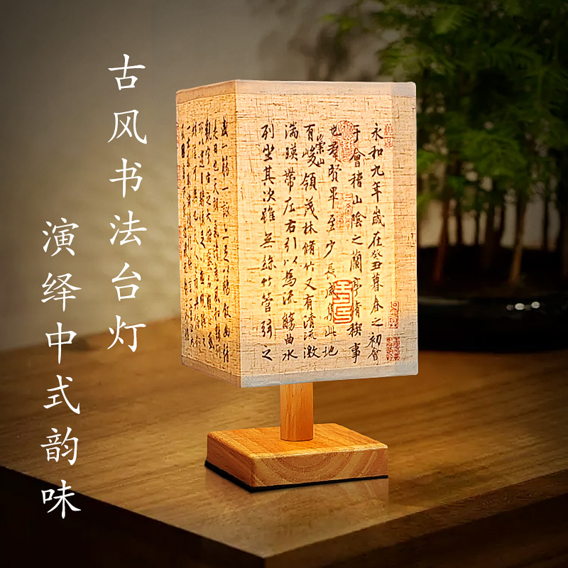 插电实木小台灯方形字体麻布简约卧室床头灯书房酒吧装饰新中式灯