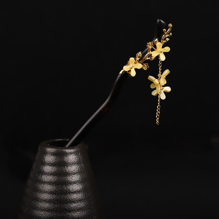 桂花簪子盘发丸子头头饰木簪黑檀木流苏发饰仙气旗袍超仙