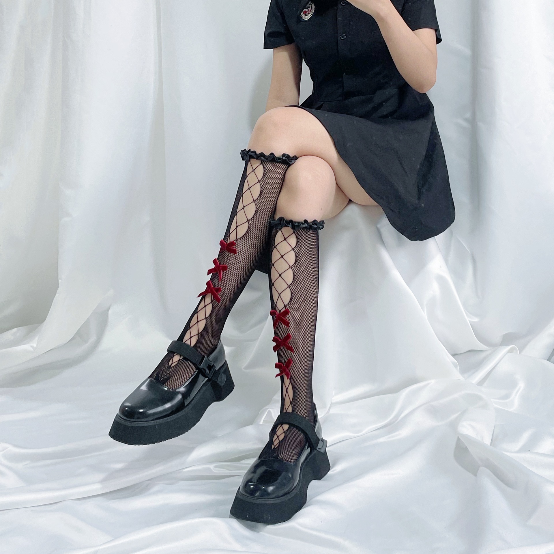 新款甜酷暗黑紫色酒红蝴蝶结蕾丝镂空小腿袜白色少女糖果系中筒袜