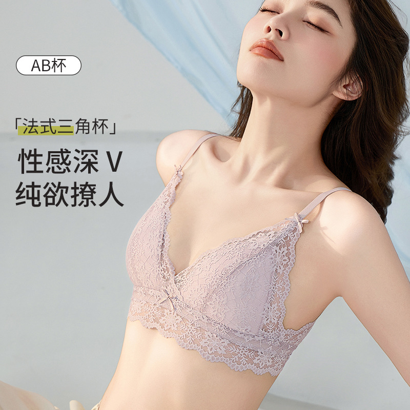 法式夏季超薄款大胸显小胸罩内衣女小胸聚拢无钢圈蕾丝三角杯文胸