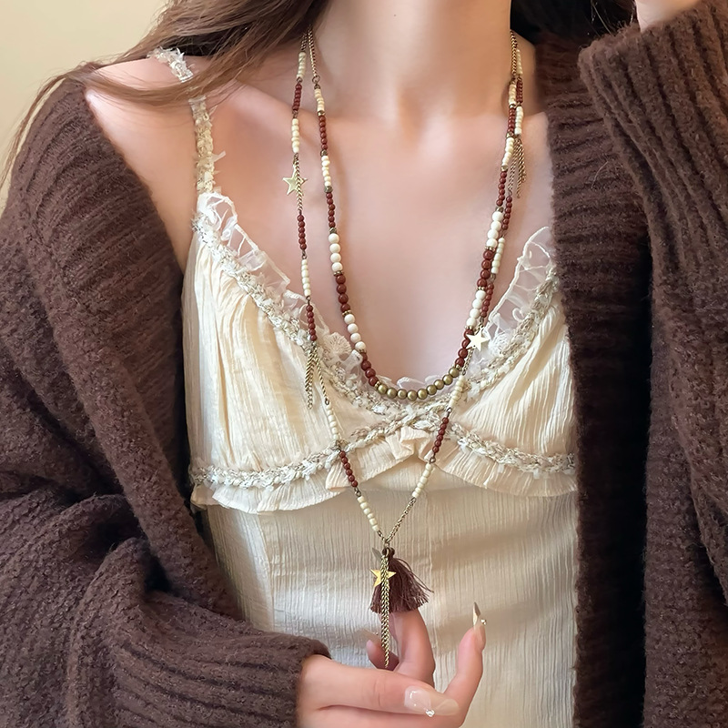 咖色串珠星星流苏项链女民族风双层叠戴毛衣链复古高级感颈链配饰