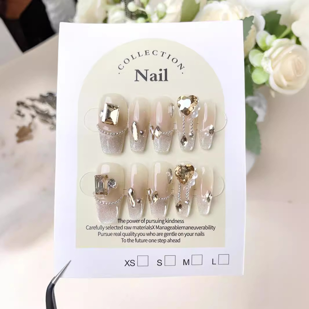 轻奢精品纯手工穿戴甲中长款爆闪香槟爱心满钻法式猫眼甲片可拆卸