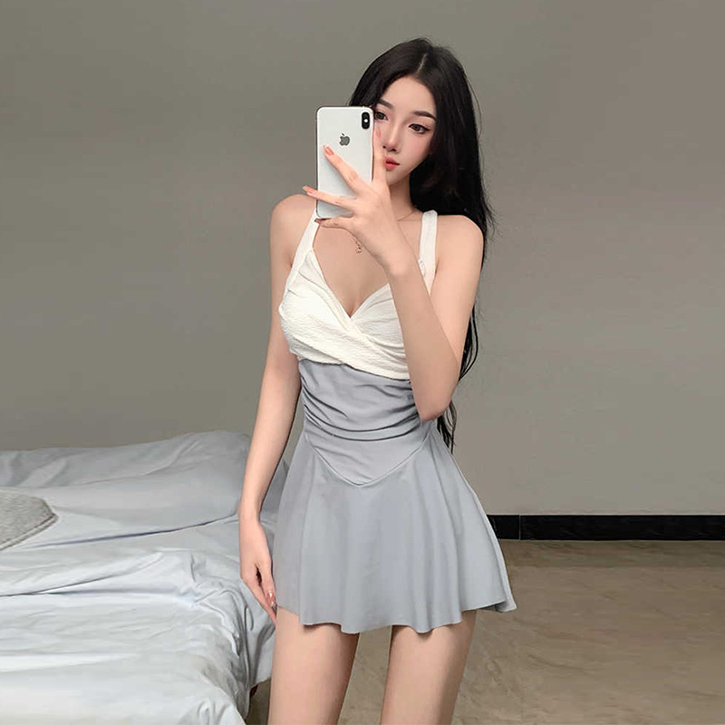 泳衣女连体吊带拼色性感露背泡温泉泳装度假显瘦修身泳衣