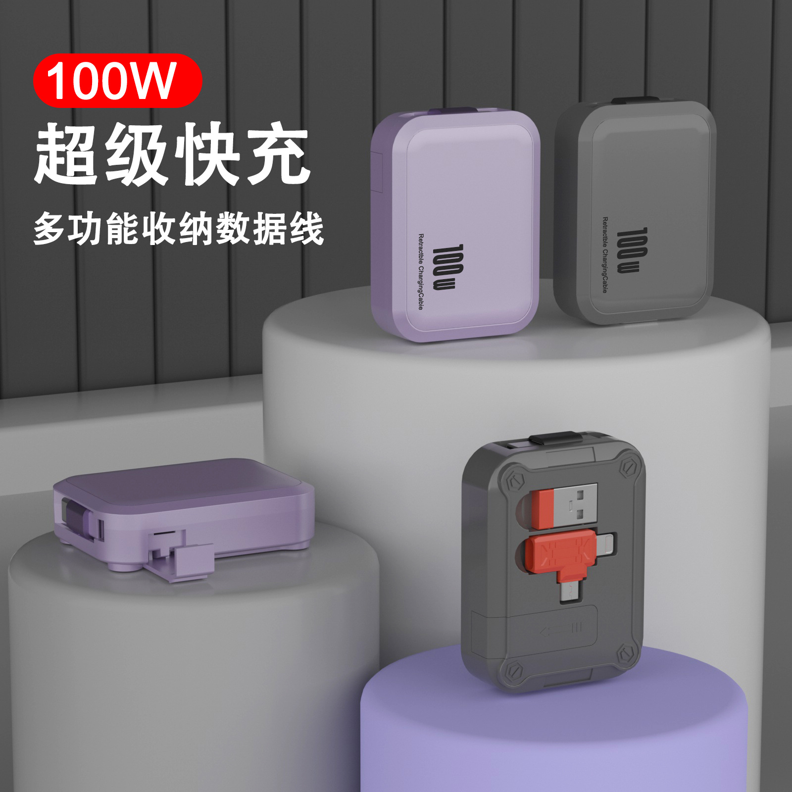 100W超级快充伸缩数据线三合一快充二拖三充电线收纳适用苹果华为