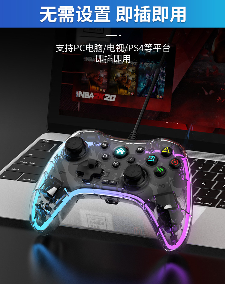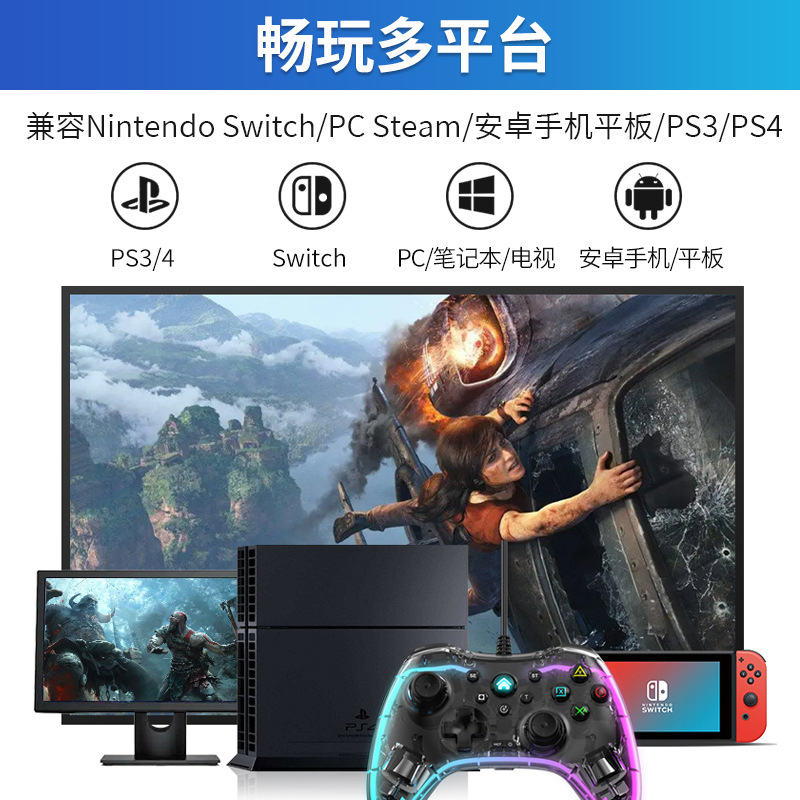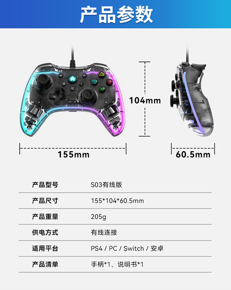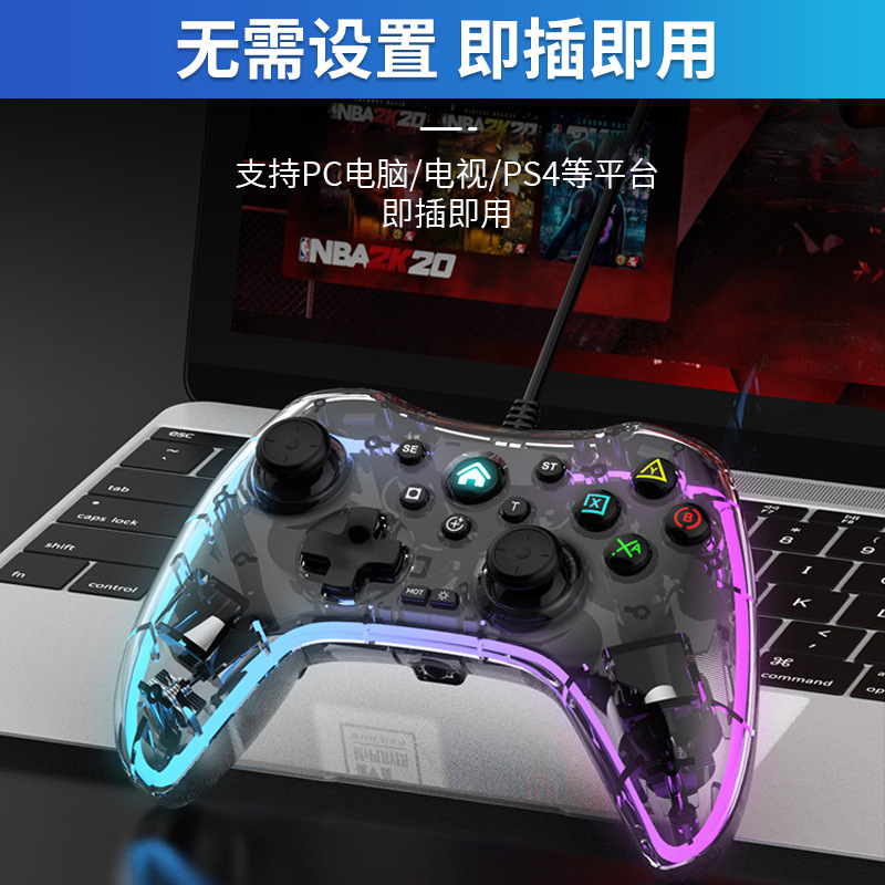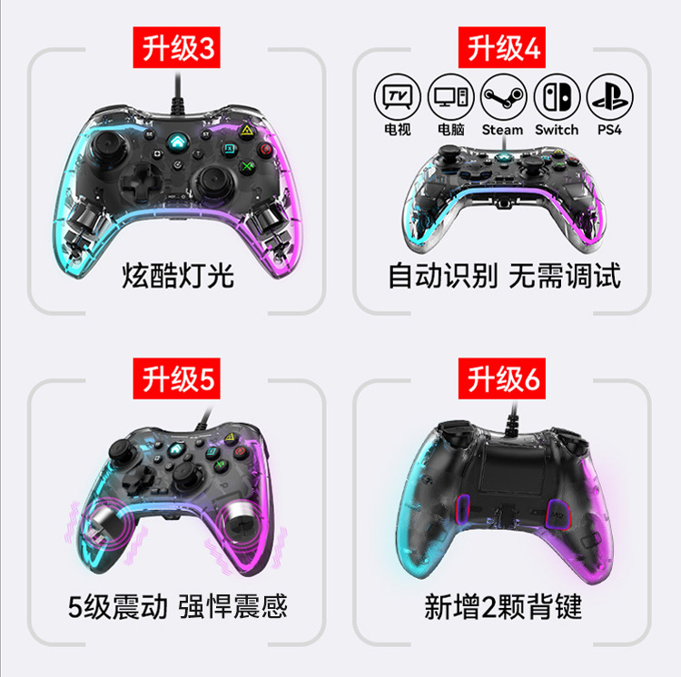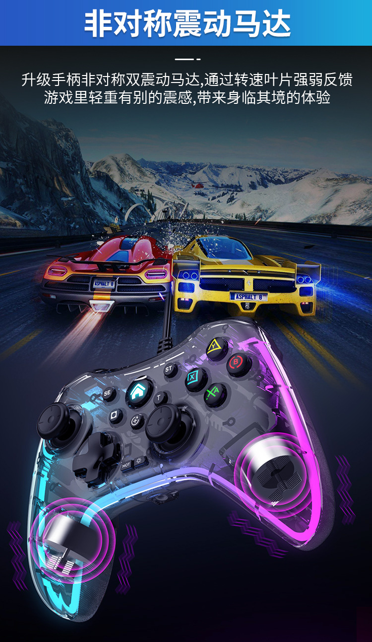 S03透明水晶炫彩游戏手柄switch有线炫光体感电脑电视PC游戏手柄