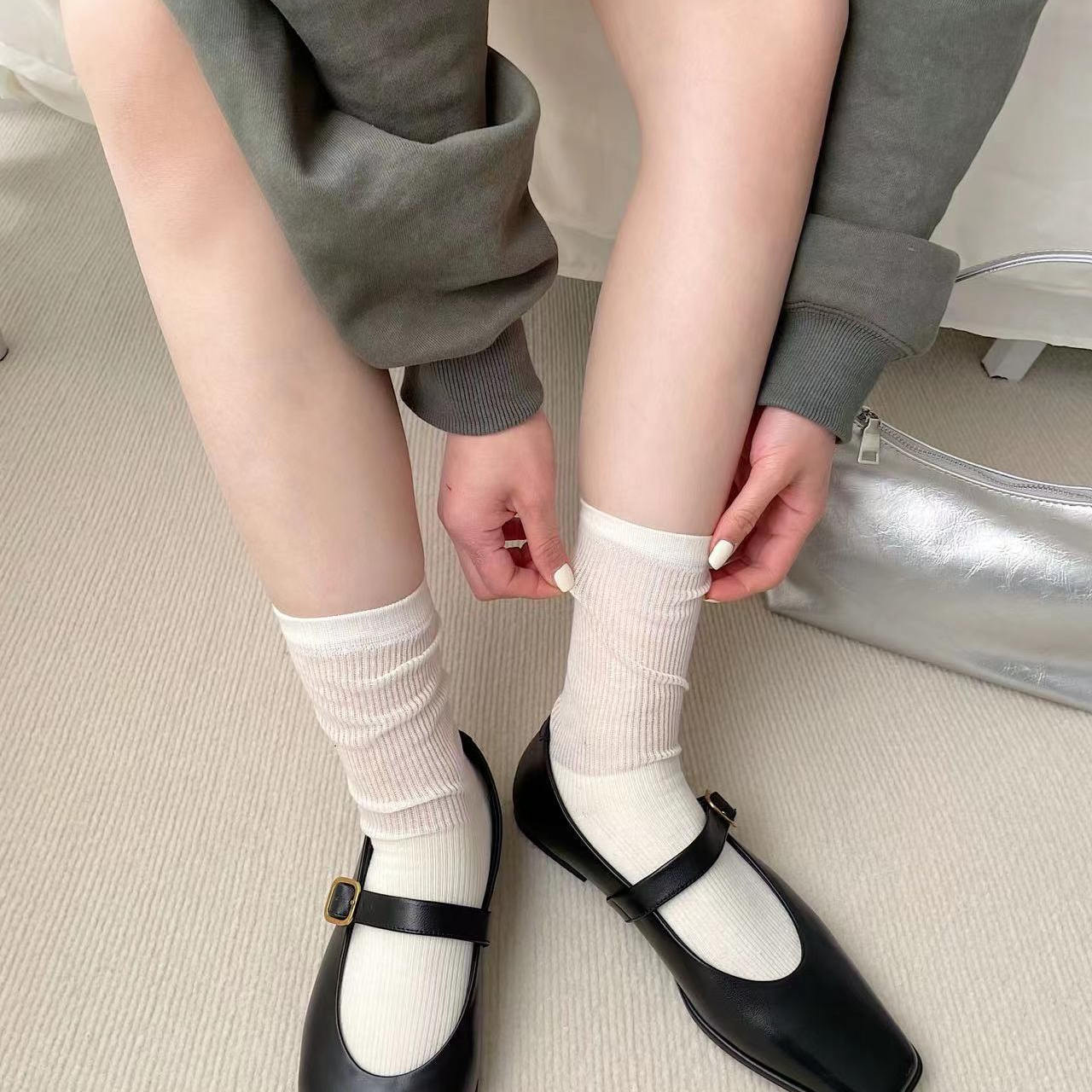 袜子女夏季薄款纯色中筒袜ins韩系慵懒透气竖条简约百搭堆堆袜棉